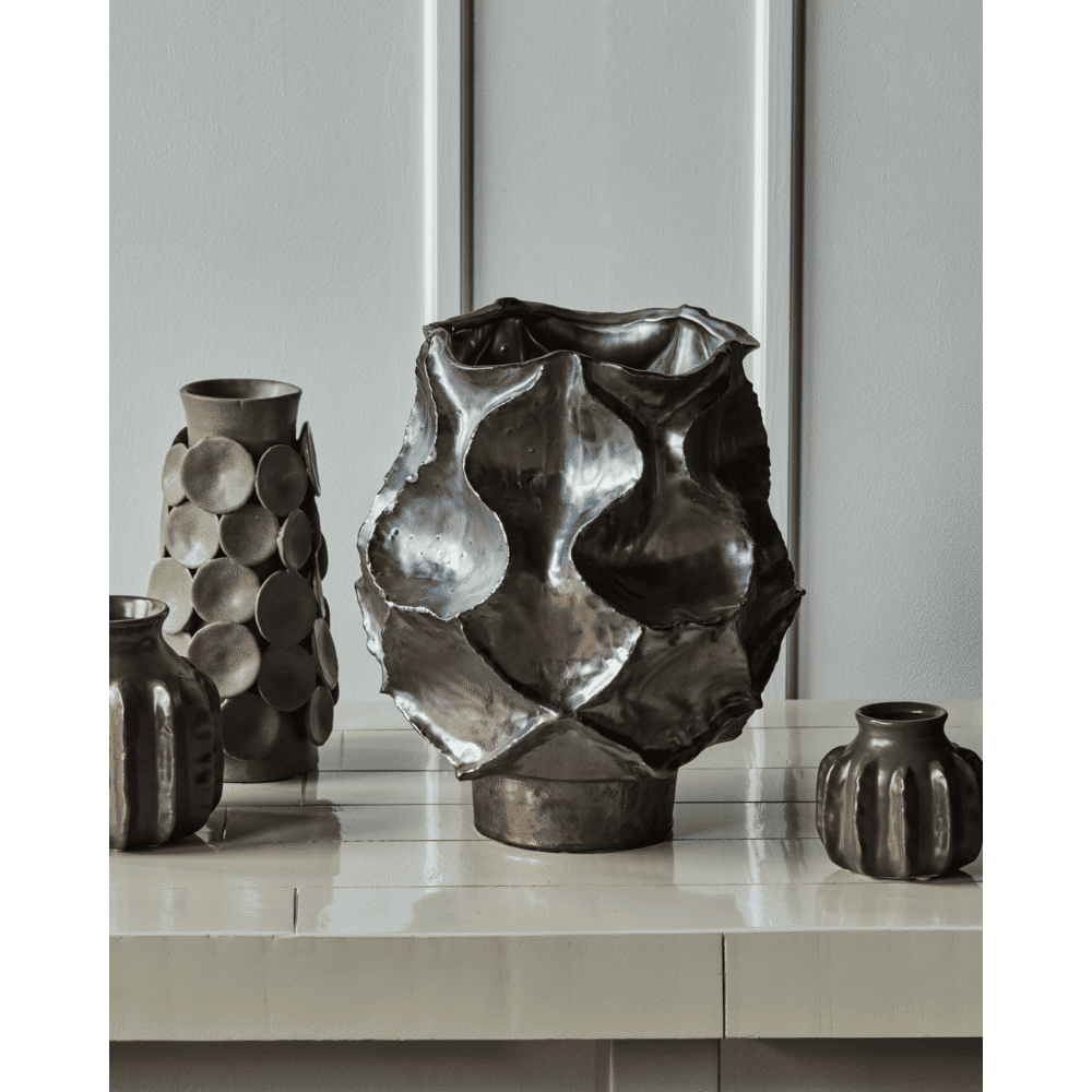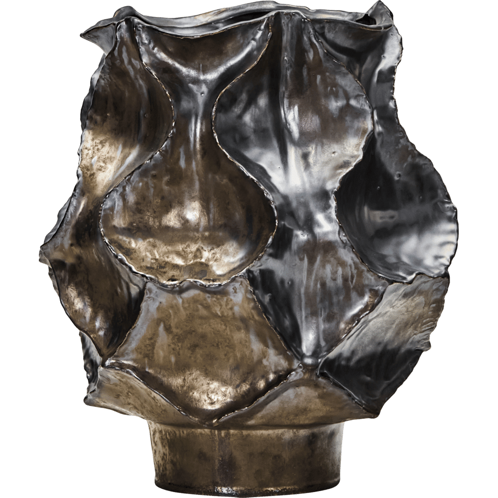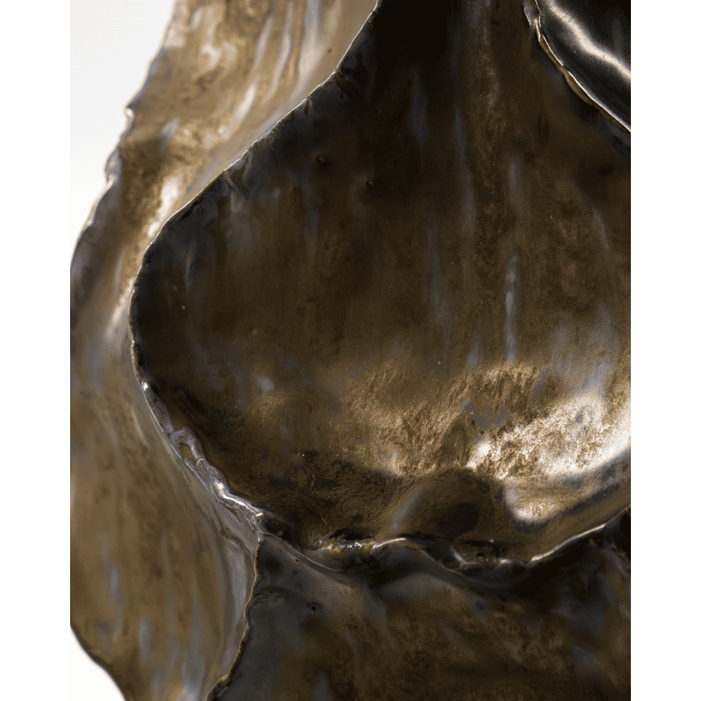 This handmade stoneware vase adds an instant wow factor with its antique metallic glaze and sculptural, organic form. Let it stand alone as a statement art piece, or pair it with striking branches and fresh flowers to express your own style.- Handmade stoneware craftsmanship.- Unique antique metallic finish.- Eye-catching organic design.- Versatile styling options.Let your interior shine with a bold decorative accent that sparks conversation. Material:Primary: Stoneware (100%) Inhoud: Foodsafe: Martindale: Montage vereist: Nee Onderhoud / reiniging: Clean with a dry cloth