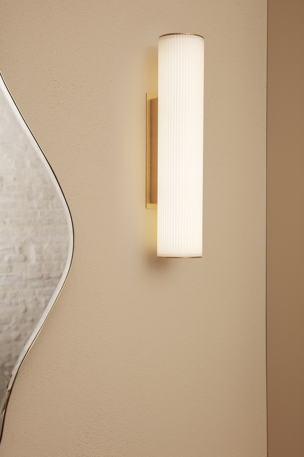 Fusing textural complexity with modern simplicity, the Vuelta Wall Lamp features cylindrical translucent opal glass with a distinct rippled surface and brushed metal finishes. With an LED light source that emits a soft, diffused light, the Vuelta Wall Lamp comes with an adjustable dimmer remote for ultimate ambiance control. Material:Mouth blown rippled Opal glass tube with solid brushed brass or steel parts. 2.5 metre white fabric cord with dimmer