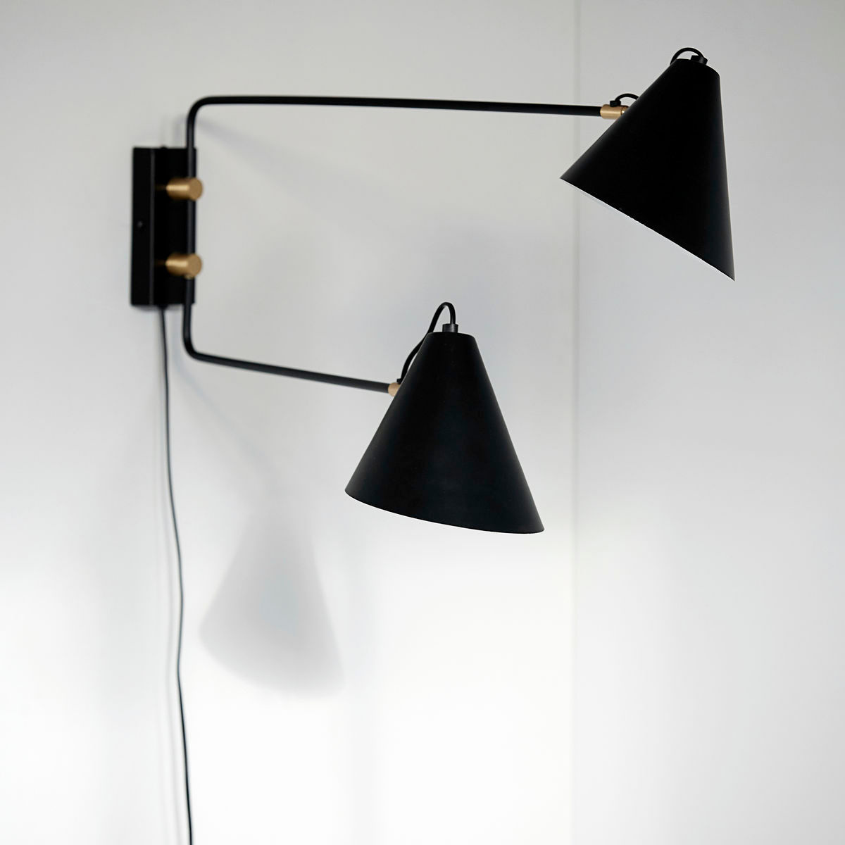 Lamps light up the darkness, and add warmth and style to your home. With the decorative wall lamp Club Double from House Doctor, you get an ambient light for your home and a beautiful decoration for the wall. The lamp is actually two lamps in one. The industrial design gives it an almost sculptural expression. And the combination of black iron and golden brass gives the design a nice, warm touch. The lamp has many functions. The arms can be adjusted from side to side, which gives you the opportunity to adjust the light in the way that you want it.