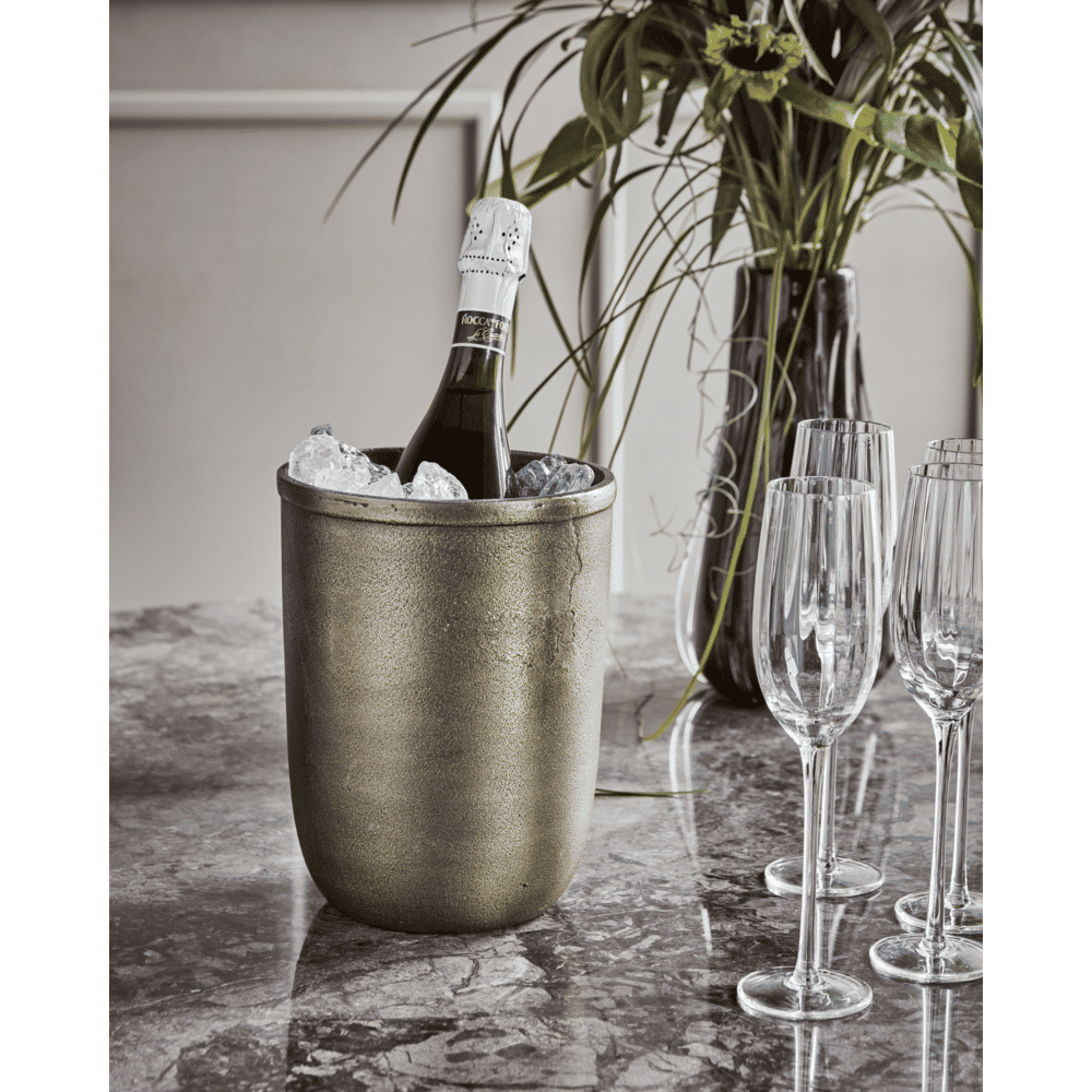 Deze wijnkoeler van aluminium met antieke messingafwerking houdt je wijn langer koel en voegt een vleugje elegantie toe aan je tafelsetting. Met zijn tijdloze ontwerp past hij perfect in elk interieur en is hij een stijlvolle aanvulling op je cocktailaccessoires.