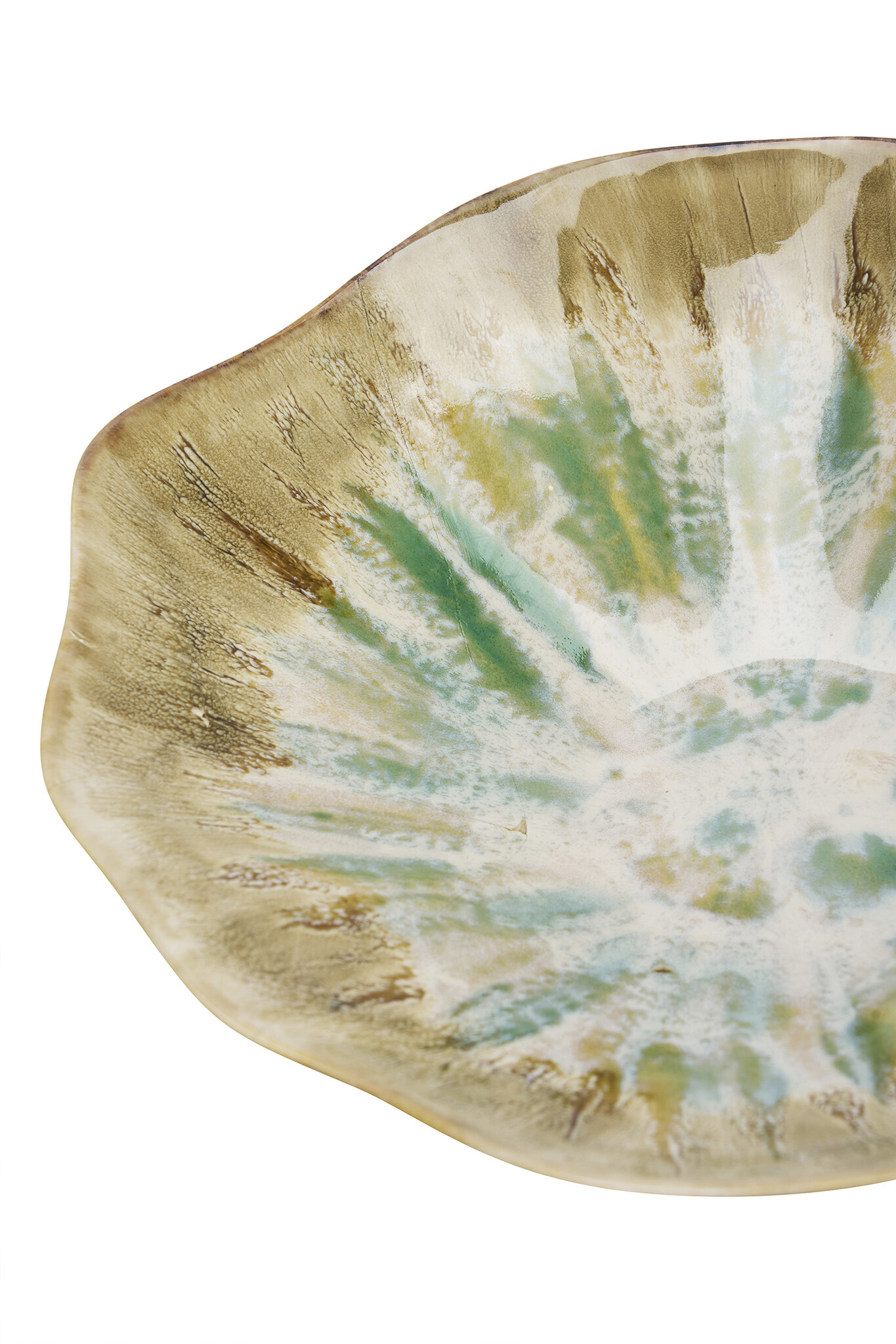 Voeg karakter toe aan je tafel met deze handgedecoreerde kom van aardewerk. De natuurlijke kleuren beige, groen en off-white worden geaccentueerd door een reactieve glazuur. De unieke vorm maakt het een opvallend en functioneel stuk.