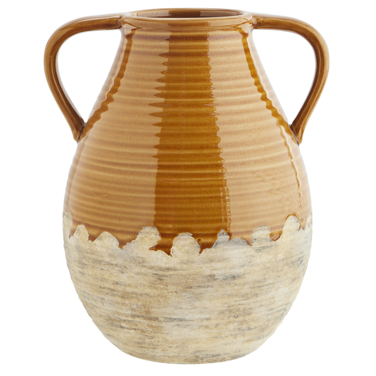 Deze mooie vaas met oren is gemaakt van aardewerk en het lijkt alsof de vaas een stuk is ondergedompeld in mosterdgeel glazuur. Het patroon van het witte glazuur kan per vaas variëren.