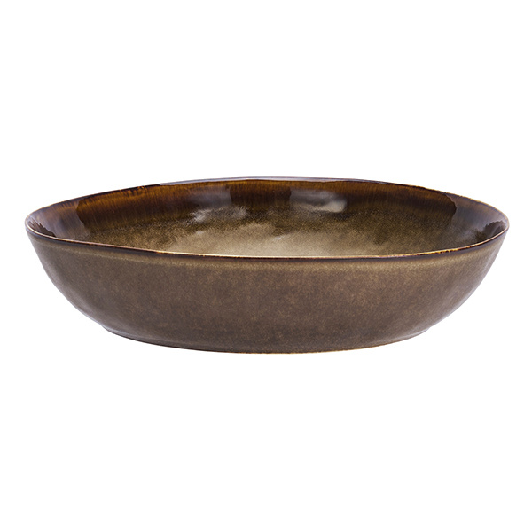 Deze royale serveerschaal van aardewerk brengt warmte en karakter op tafel. De diepe bruine kleur en reactieve glazuurlaag zorgen voor een unieke look. Perfect voor salades, fruit of als decoratief stuk op je keukeneiland.
