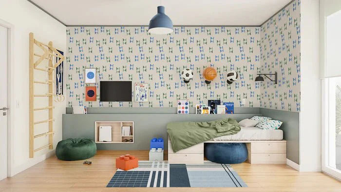 De gekleurde driehoekjes op het behang zorgen voor een speels effect op de muur. Ongeacht je leeftijd, dit behang tovert gegarandeerd een glimlach op je gezicht. Dus breng wat kleur in je leven en geef je kamer een make-over met deze vrolijke print!