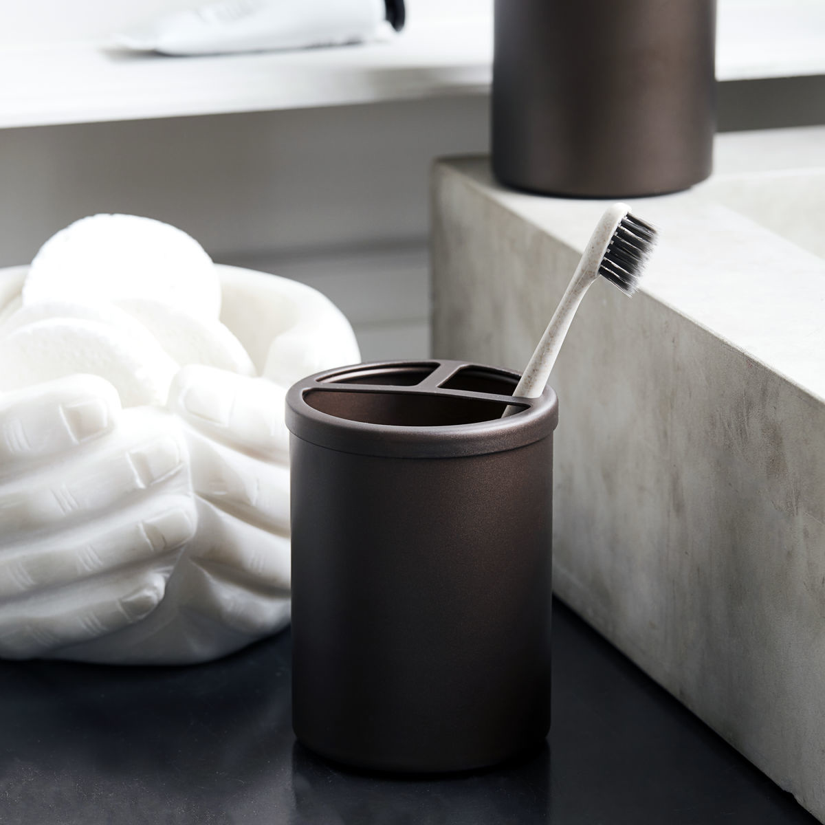 Gebruik deze aluminium tandenborstelhouder om je badkamer een snelle update te geven zonder de bank te breken. House Doctor heeft Bush een matbruine kleur gegeven die een tijdloos, maar tegelijkertijd modern accent aan je badkamerinrichting toevoegt. Plaats je tandenborstels in de twee kleine compartimenten en gebruik het grote compartiment voor tandpasta. Je kunt het deksel gewoon verwijderen om hem te wassen.