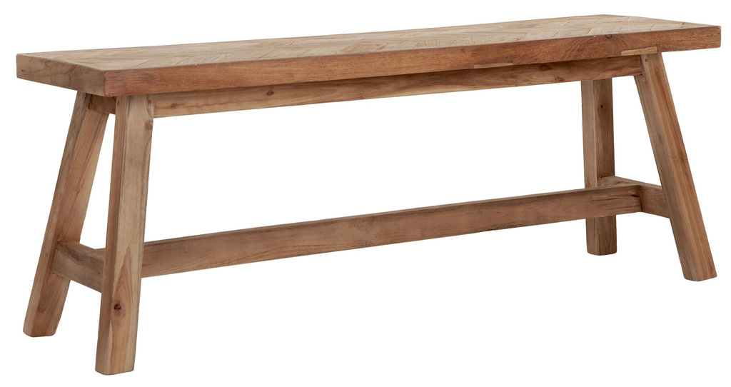 Deze bank van gerecycled teakhout heeft een robuuste uitstraling en is tegelijkertijd verfijnd in zijn eenvoud. Het visgraatpatroon geeft de bank een ambachtelijke touch, perfect voor aan het voeteneinde van het bed of als extra zitplek in de hal. Wat maakt 'm bijzonder: Uniek visgraatpatroon voor extra karakter Gemaakt van gerecycled teakhout met natuurlijke charme Combineert mooi met diverse woonstijlen Productspecificaties: Kleur: Naturel Materiaal: Teakhout (gerecycled) Afmetingen: 120 x 45 x 32 cm
