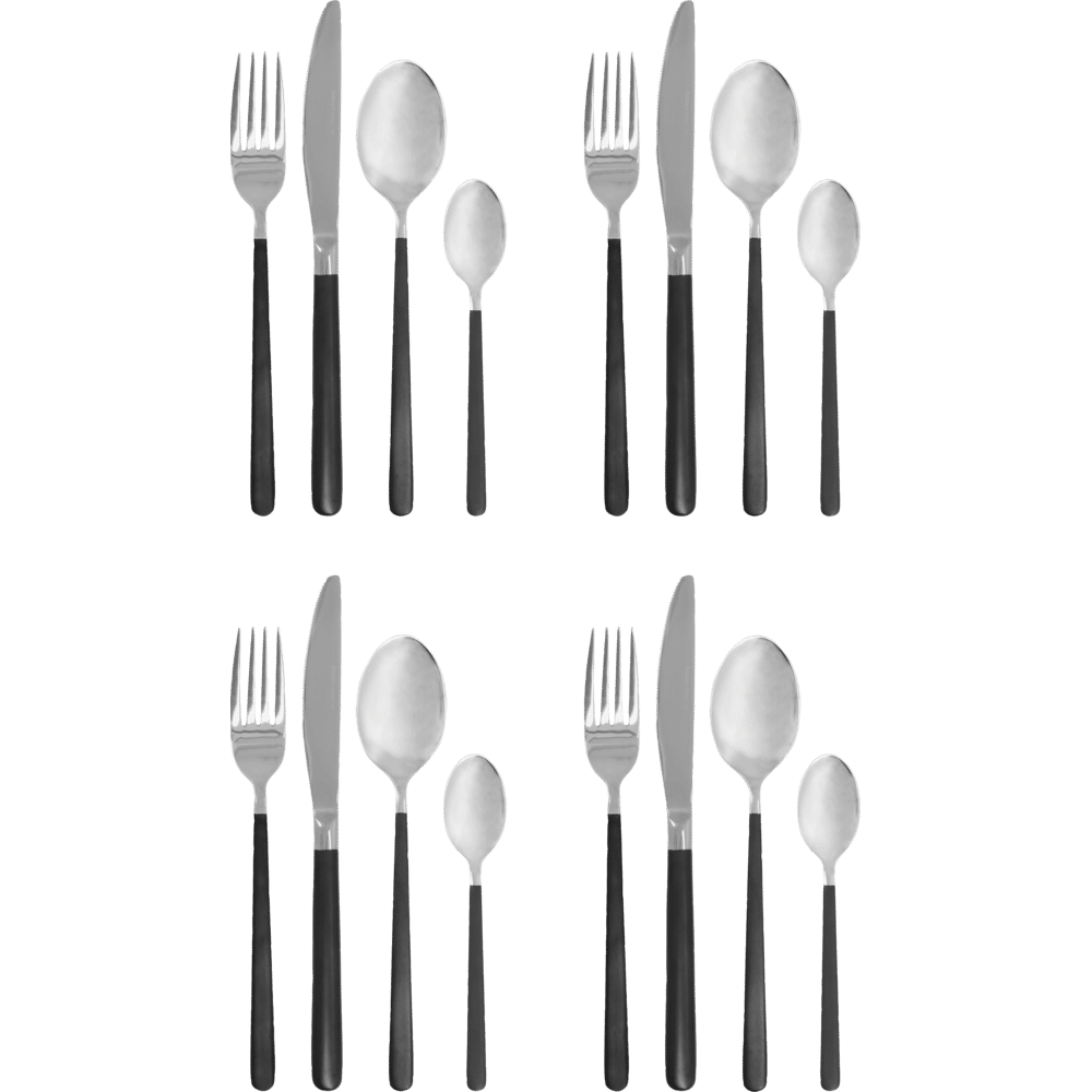 Maak van elke maaltijd een stijlvolle ervaring met deze 16-delige bestekset in zwart en zilver. Het roestvrij staal is voorzien van een titaniumcoating voor een luxe, moderne uitstraling. Perfect voor etentjes met vrienden, maar ook een verfijnde keuze voor dagelijks gebruik. Elegant, robuust en een tikkeltje edgy.
