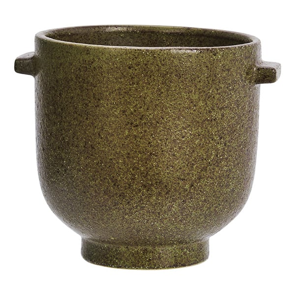 Deze grotere aardewerken bloempot in olijfgroen is perfect voor een volle kamerplant of als solostuk op een lage kast. Het rustgevende kleurgebruik en de robuuste vorm geven een natuurlijke uitstraling aan ieder interieur. Mooi te combineren met het kleinere formaat.
