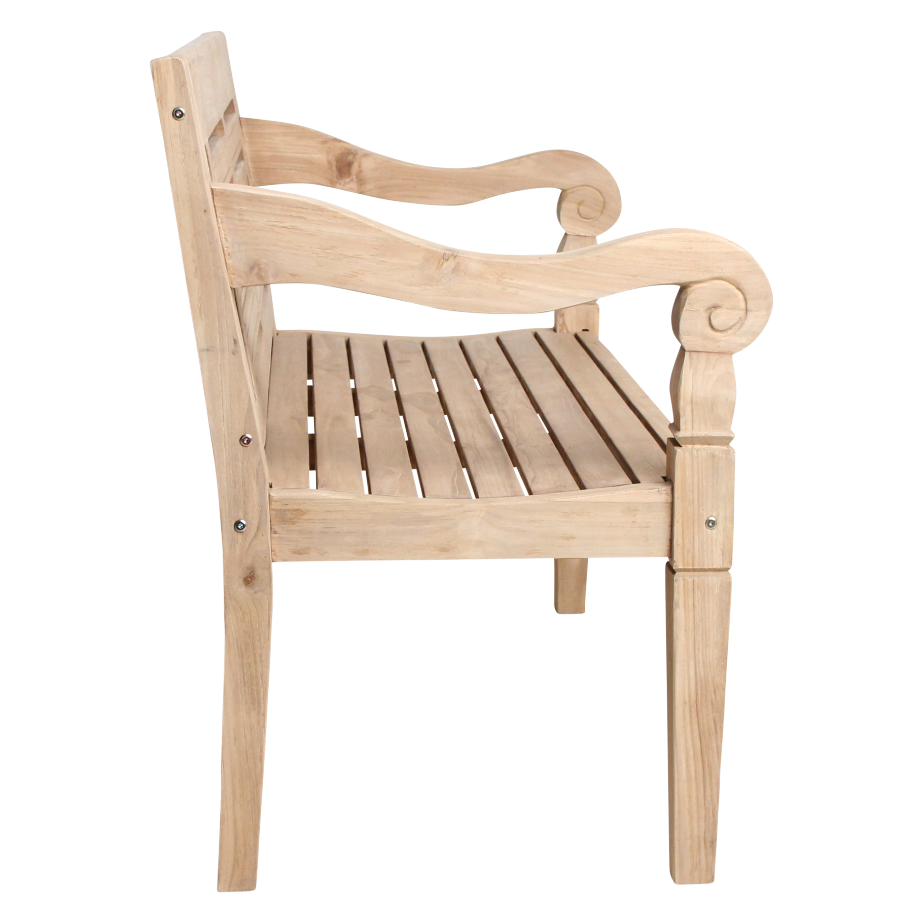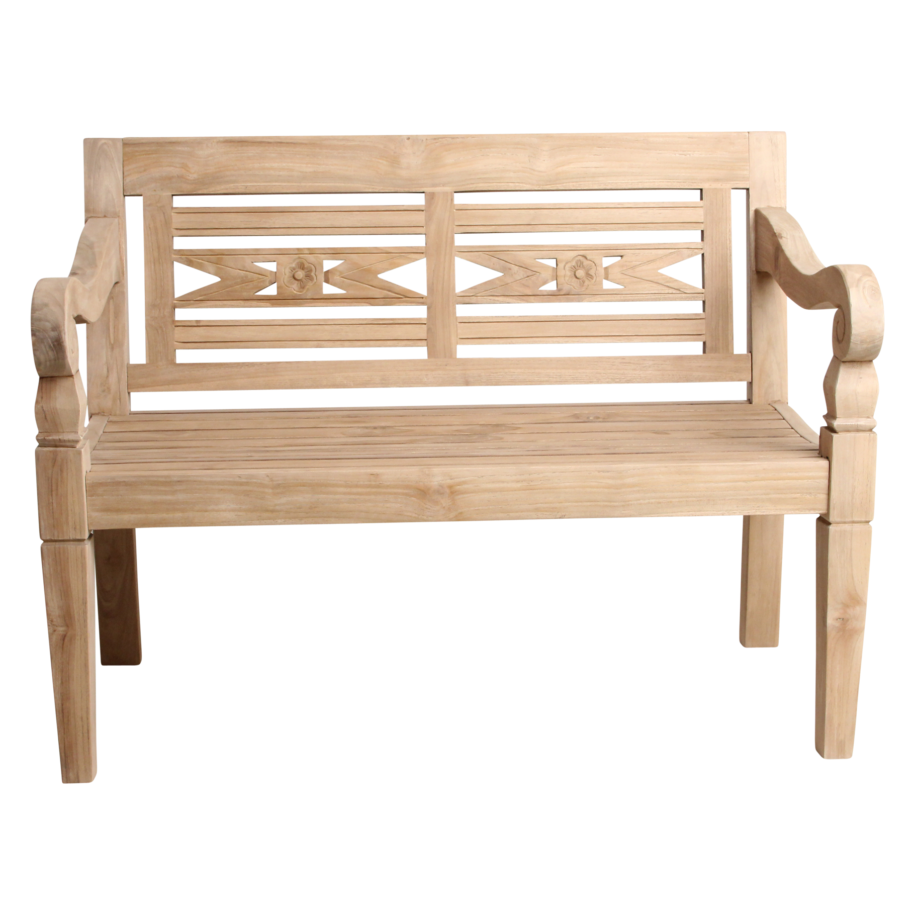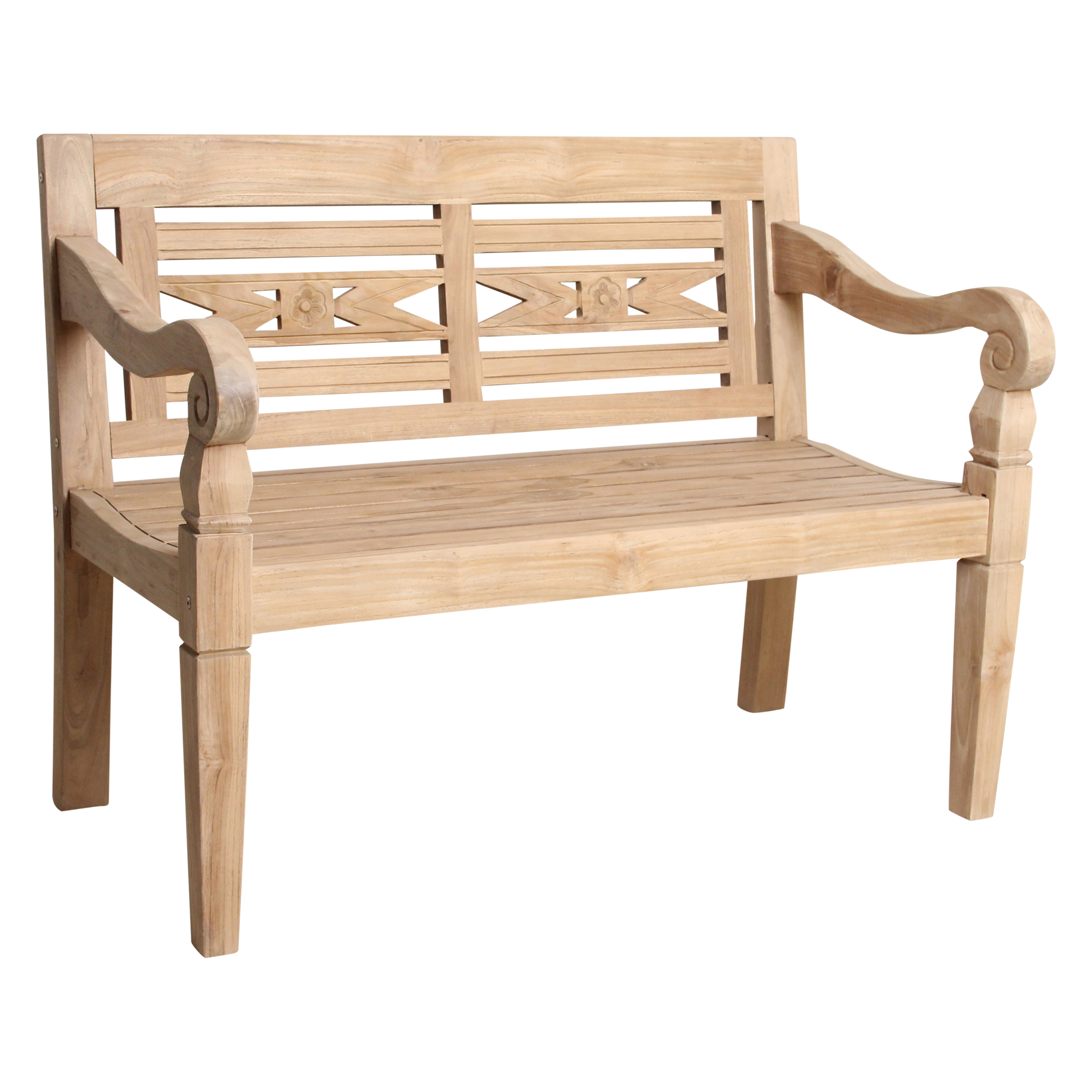 Breng een vleugje zon en ontspanning naar je tuin met deze teakhouten tuinbank, geschikt voor twee personen. Het hoogwaardige hout staat bekend om zijn duurzaamheid en wordt alleen maar mooier met de jaren. Laat de bank gewoon buiten staan: zonder behandeling ontwikkelt het hout een sfeervolle, vergrijsde uitstraling die perfect past bij een stijlvolle buitenruimte. Unieke Ibiza-details Kijk eens naar de prachtige handgesneden vormen in de rugleuning. De subtiele bloem en organische lijnen geven deze bank een speels, bijna bohemien tintje. Alsof je terras een klein stukje eilandvibe cadeau krijgt.