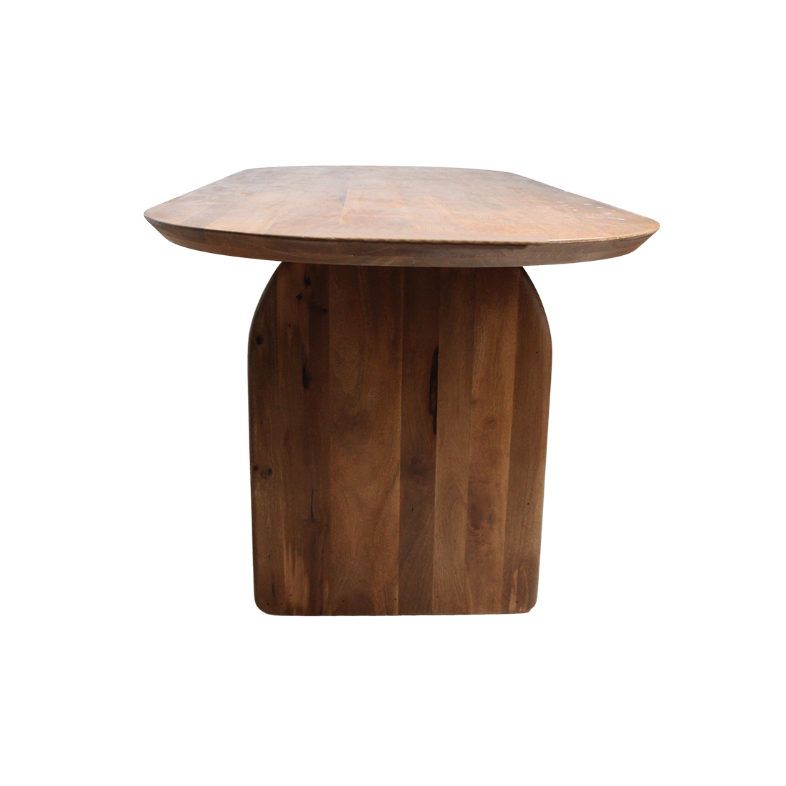 De Bullnose meubels zijn gemaakt van speciaal mangohout uit India. Dit hout is duurzaam omdat het een bijproduct is van de mango-industrie: wanneer de bomen hun fruitproductie hebben afgerond, worden ze gekapt en herplant. Mangobomen groeien snel, in slechts 15 jaar, terwijl bijvoorbeeld eiken 50 tot 100 jaar nodig hebben. Dit proces zorgt ervoor dat er geen tropisch regenwoud wordt gekapt en dat het hout een tweede leven krijgt als robuust meubel. Het natuurlijke hout heeft een warme kleur en subtiele variaties, waardoor elk meubelstuk uniek en karaktervol is. Het blad heeft een lichte vintage touch met zaagsneden en nerven die het organische karakter van de tafel benadrukken.