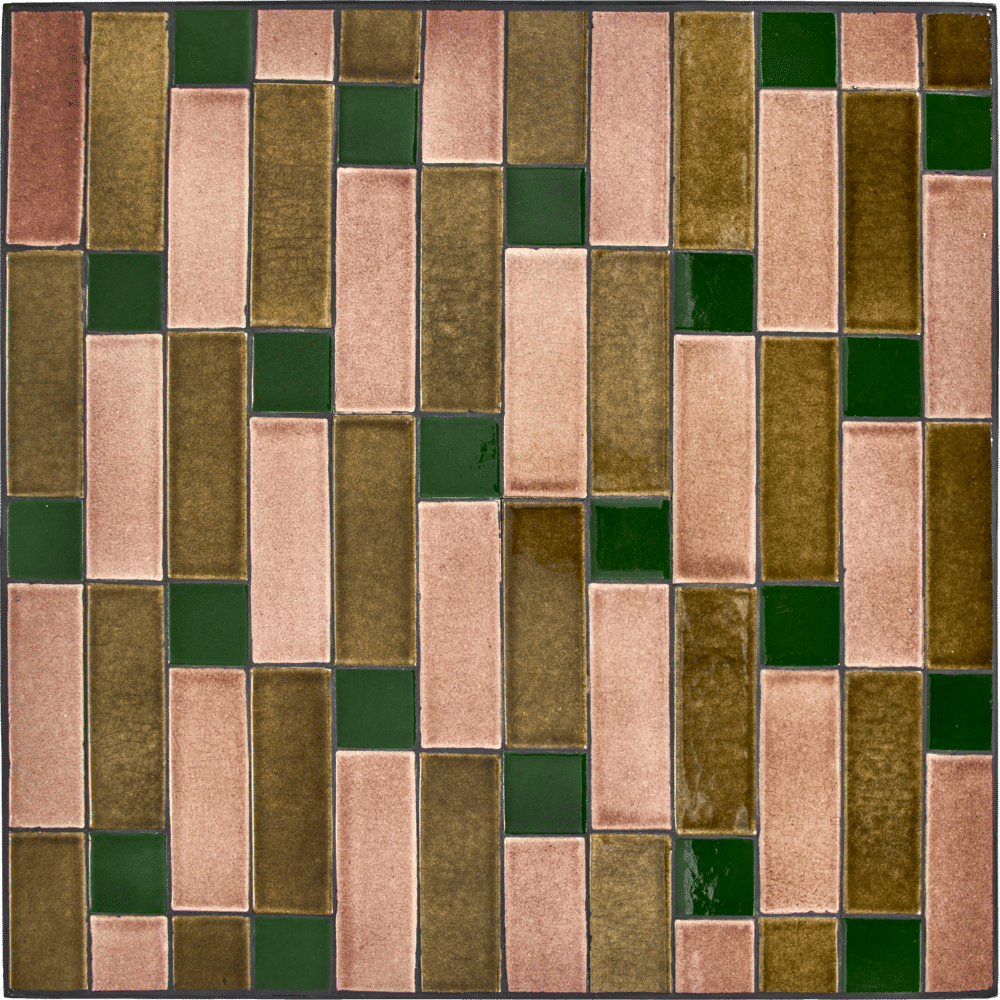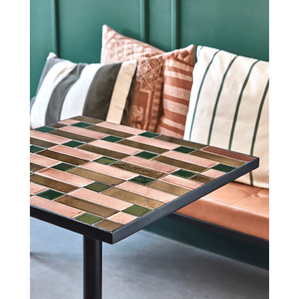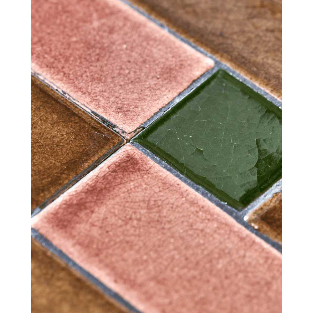 Geef je interieur een moderne uitstraling met dit opvallende handgemaakte tafeltje. De glanzende keramische tegels in roze, bruin en donkergroen vormen een prachtige mozaïek op het tafelblad, terwijl het zwarte ijzeren onderstel een stoer industrieel tintje toevoegt. Perfect voor naast een zwarte of groene stoel, en een echte blikvanger in elke kamer.