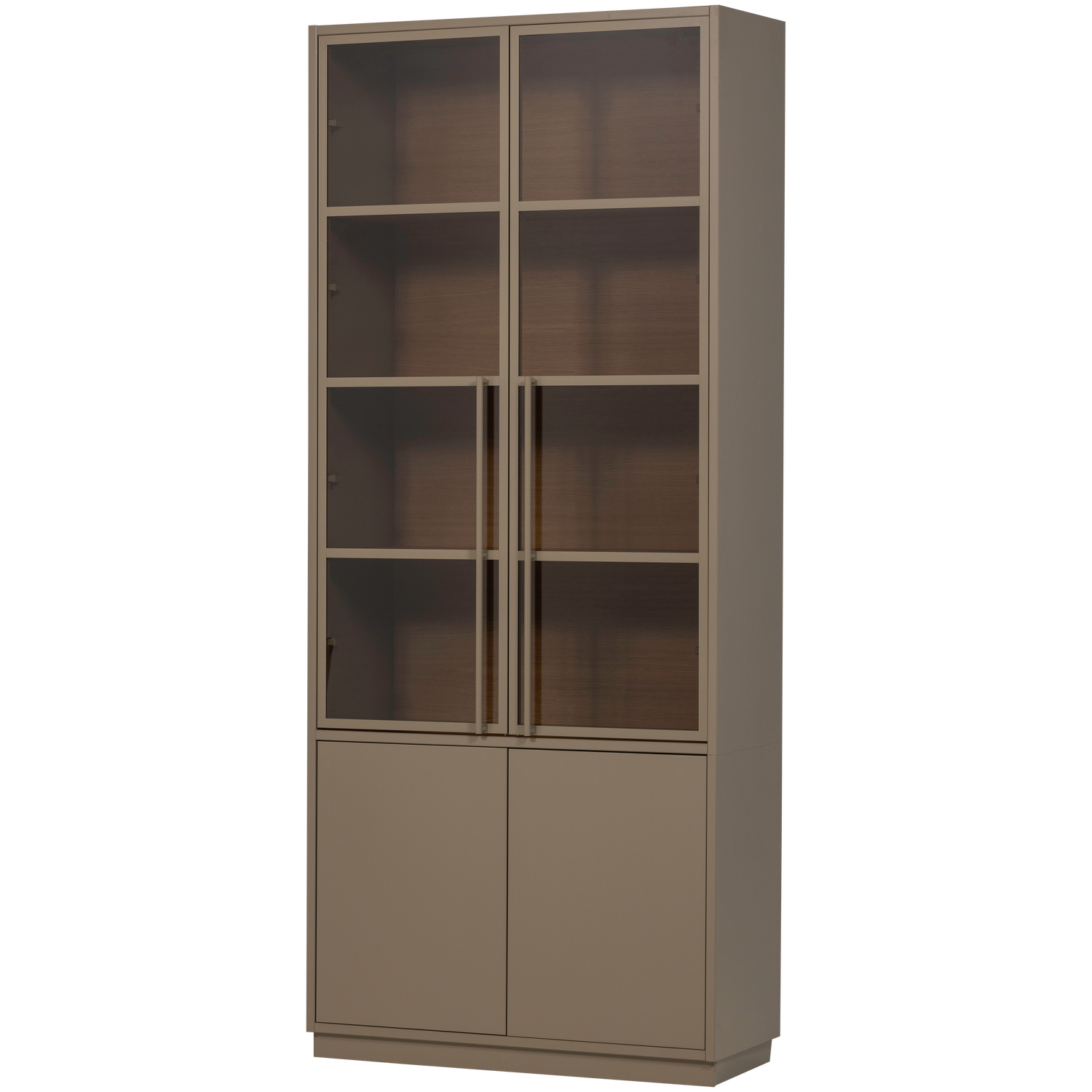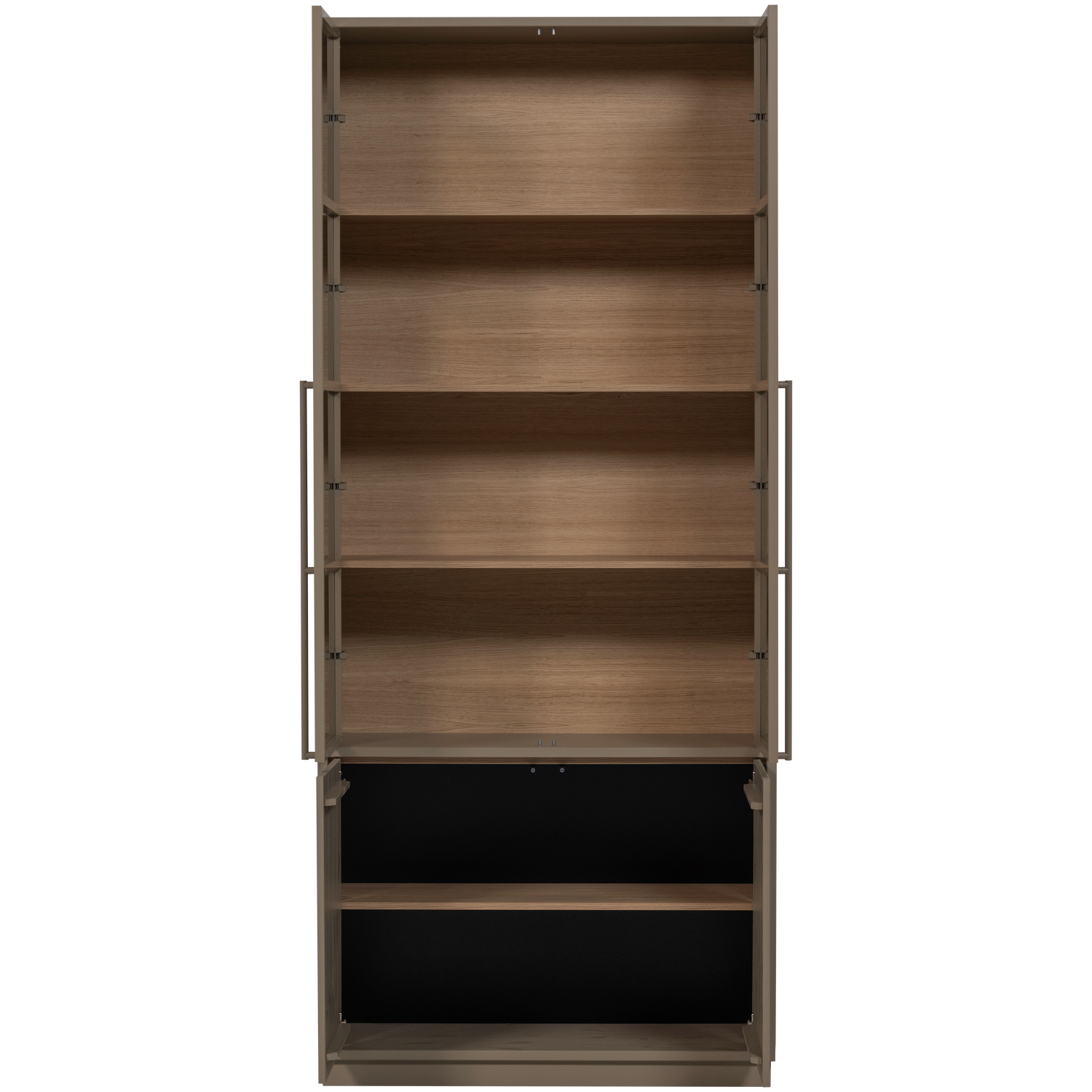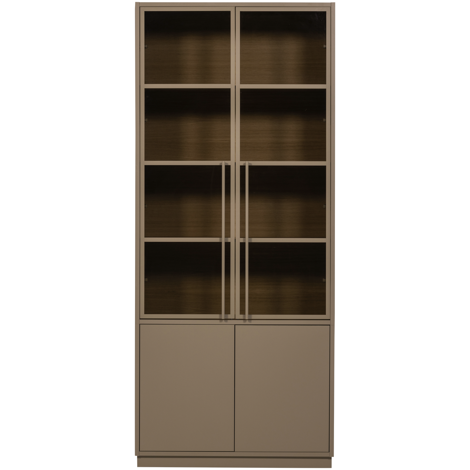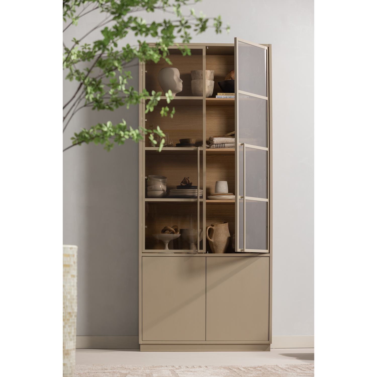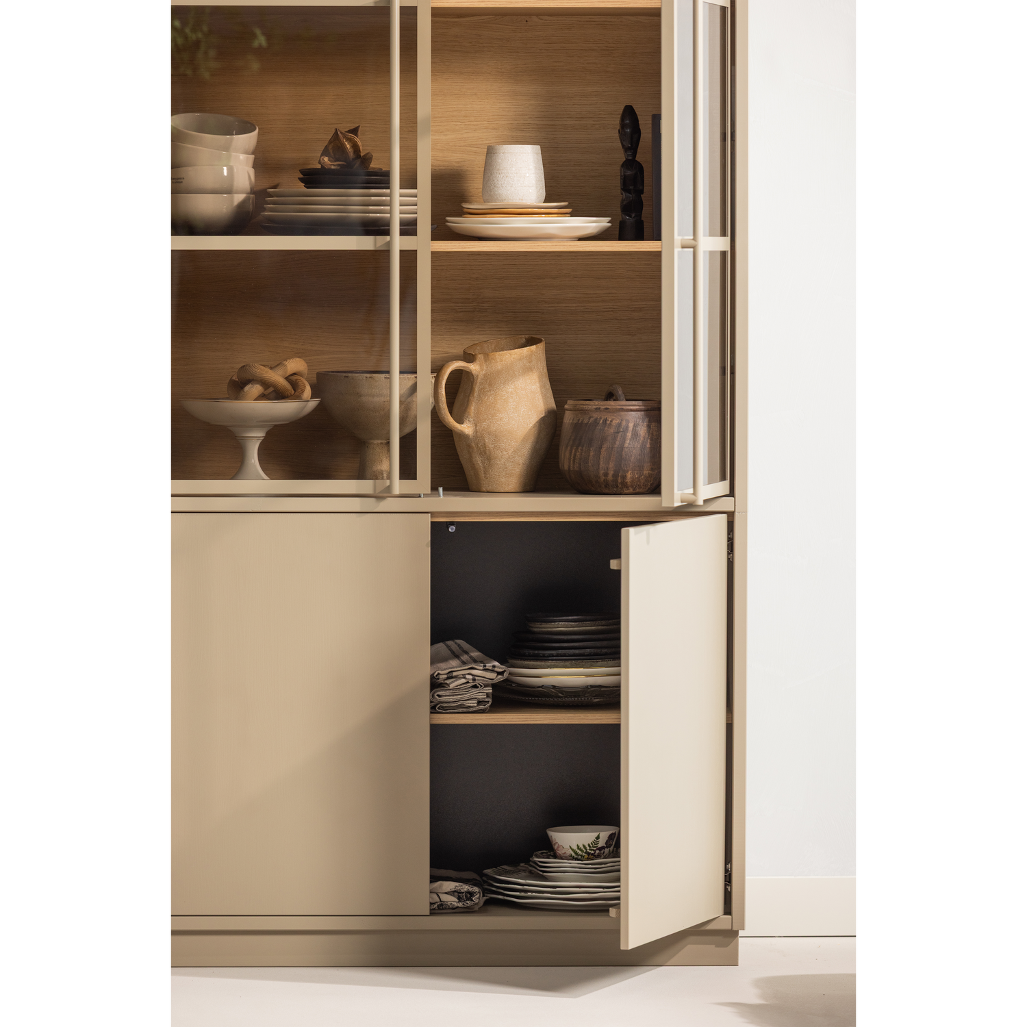 De Casa buffetkast van WOOOD combineert open en gesloten vakken voor een veelzijdige opbergoplossing. De modieuze mud kleur en glazen deuren met eiken decor zorgen voor een luxe uitstraling.