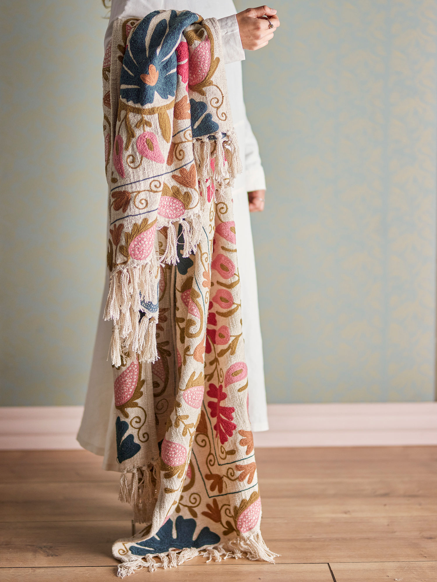 The Ceva Throw by Bloomingville is a beautifully woven cotton throw with a detailed embroidered design in soft colors. The warm shades of brown, pink, and blue and the delicate pattern make the throw perfect for creating a cozy atmosphere in any room.
