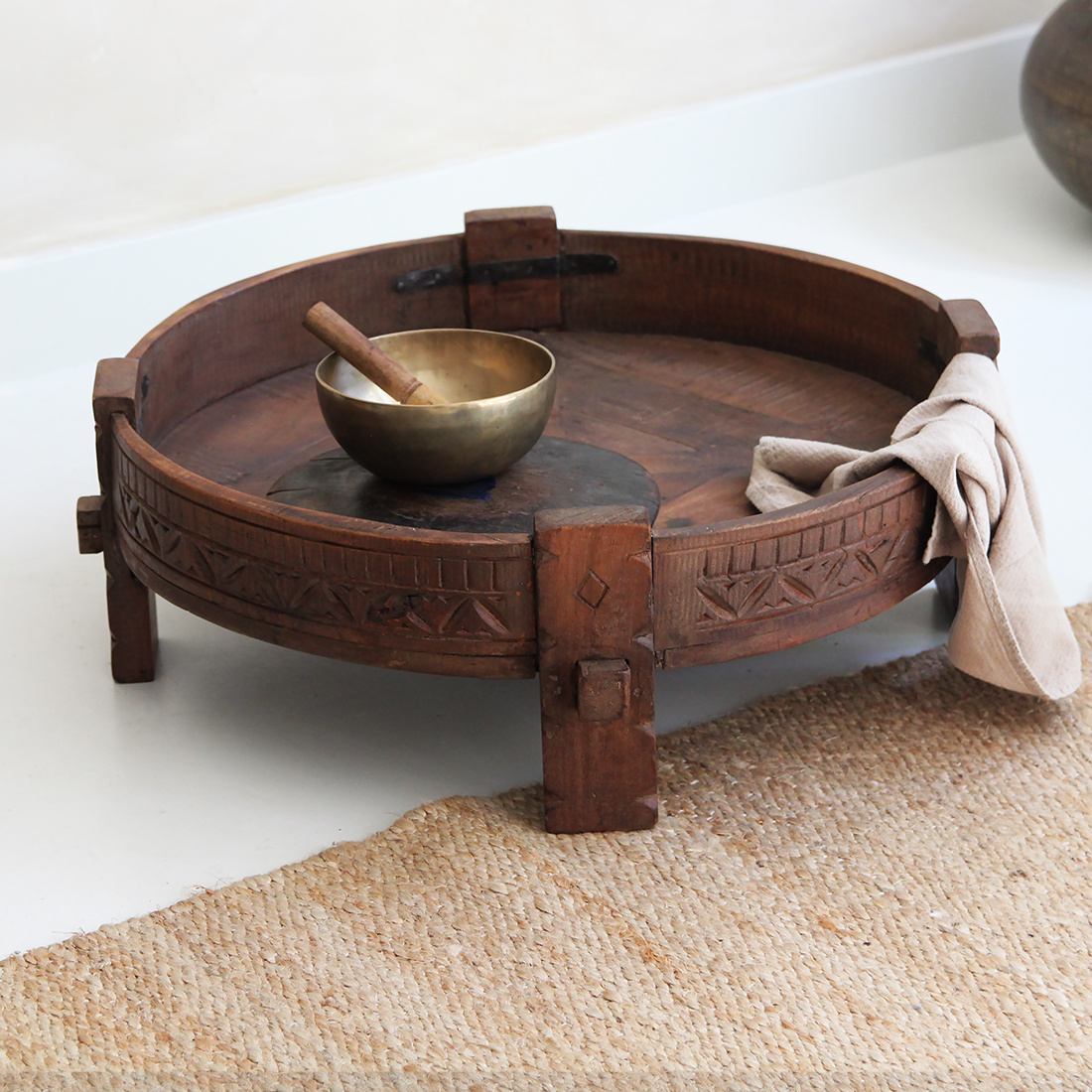 Stel je voor: een ontspannen avond op de bank met een goed boek of een film. Deze grinder-tafel staat in het midden van de zithoek, gestyled met je favoriete kaarsen, een mooie schaal en misschien een paar kleine plantjes die prachtig afsteken tegen het donkere hout. Door de hoge rand blijven al je spullen netjes op hun plek en krijgt het geheel de uitstraling van een groot, decoratief plateau. Leg een paar grote kussens op de grond om de tafel heen voor een gezellige, oosterse sfeer in je woonkamer. Waar je hem ook neerzet, hij maakt elke hoek in huis meteen sfeervol en komt eigenlijk altijd wel van pas.