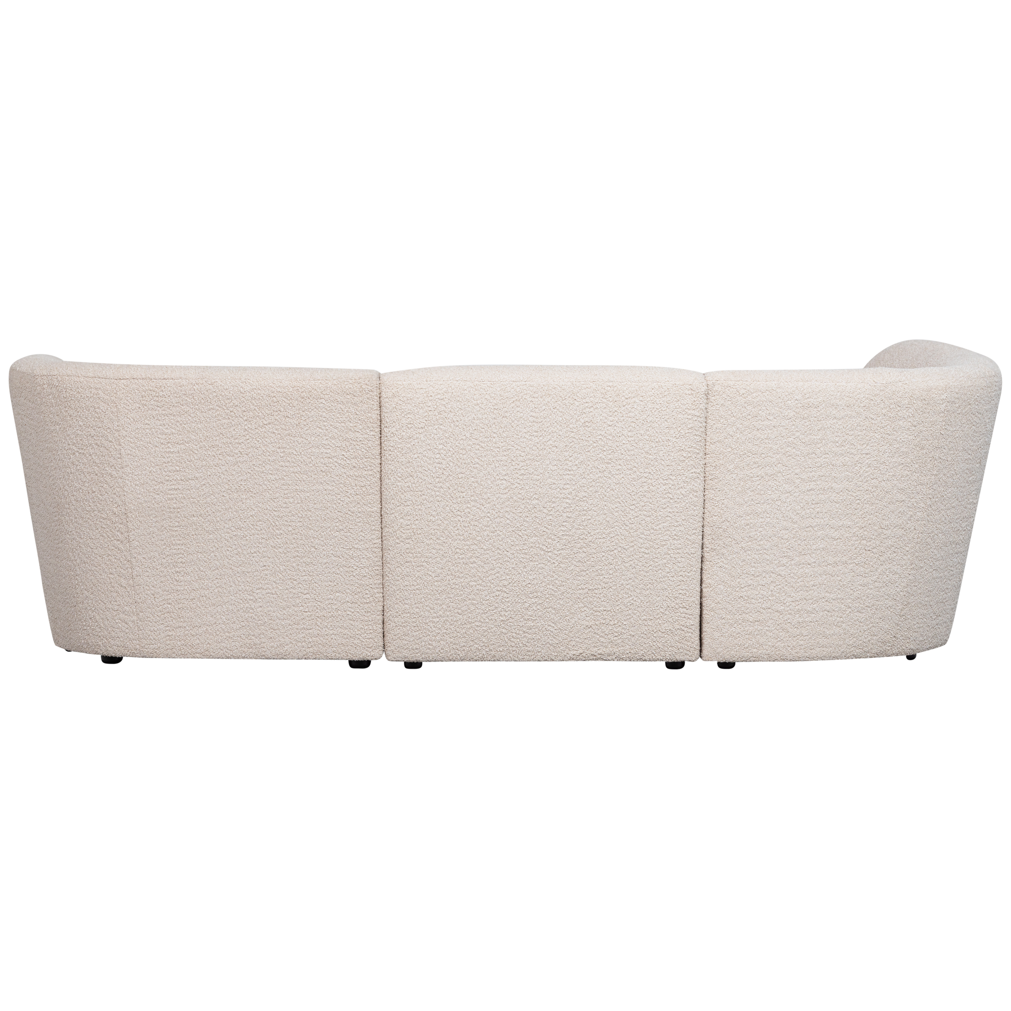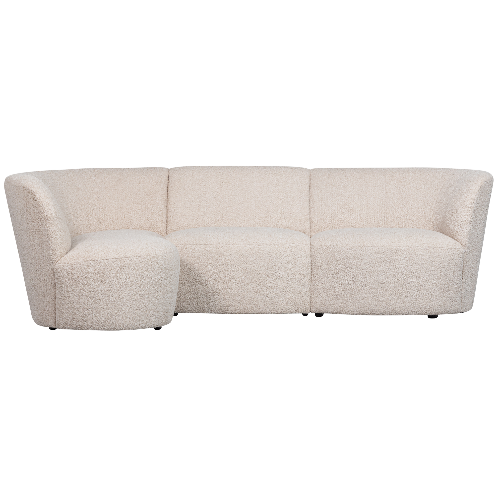- 3-zits chaise longue bank - Speels vormgegeven design - Bekleed in een wollige boucle (100% polyester) - H 70 cm x B 230 cm x D 138 cm De Coco-serie, uit de collectie van het Nederlandse interieurmerk WOOOD, is zeer geschikt voor de grote en kleine woonruimtes. De Coco elementen zijn zeer compact van formaat, hebben een zacht afgerond design en zijn ook los in de ruimte te plaatsen vanwege de stoffering aan elke zijde. Materiaal Onze zachte Almón boucle heeft een elegante textuur die meteen warmte in huis brengt. De boucle stof heeft een Martindale van 60.000, dat betekent dat de stof geschikt is voor redelijk intensief gebruik. De dichte weeftechniek zorgt voor de sterkte van de stof, dit maakt dat de Almón boucle niet snel zal slijten of scheuren. Ook heeft elke kleur een hoge kleurvastheid, maar het is aangeraden om direct zonlicht te vermijden om kleurnuances te voorkomen. Afmetingen - Hoogte: 70 cm - Breedte: 230 cm - Diepte: 138 cm - Zithoogte: 42 cm - Zitbreedte: 190 cm - Zitdiepte: 52/118 cm - Leuninghoogte: 70/28 cm - Leuningdikte: 20 cm - Poothoogte: 2 cm - Pootdikte: ø 3 cm - Draaggewicht: 100 kg per zitplaats Onderhoud Bij eventuele vlekken direct droogdeppen met een schone doek of tissue. Beslist niet wrijven! De meeste vloeistoffen zijn te verwijderen met lauw water. Maak gebruik van een zachte, ronddraaiende beweging van buiten naar binnen. Voor jarenlange vlekbescherming kan de stof worden geïmpregneerd. Impregneer het zitmeubel zo snel mogelijk na ontvangst om direct een goede bescherming te waarborgen. Levering De Coco-elementen worden per stuk geleverd. Plaats voor het beschermen van harde vloeren viltglijders aan de onderzijde van de kunststoffen vloerbeschermers.