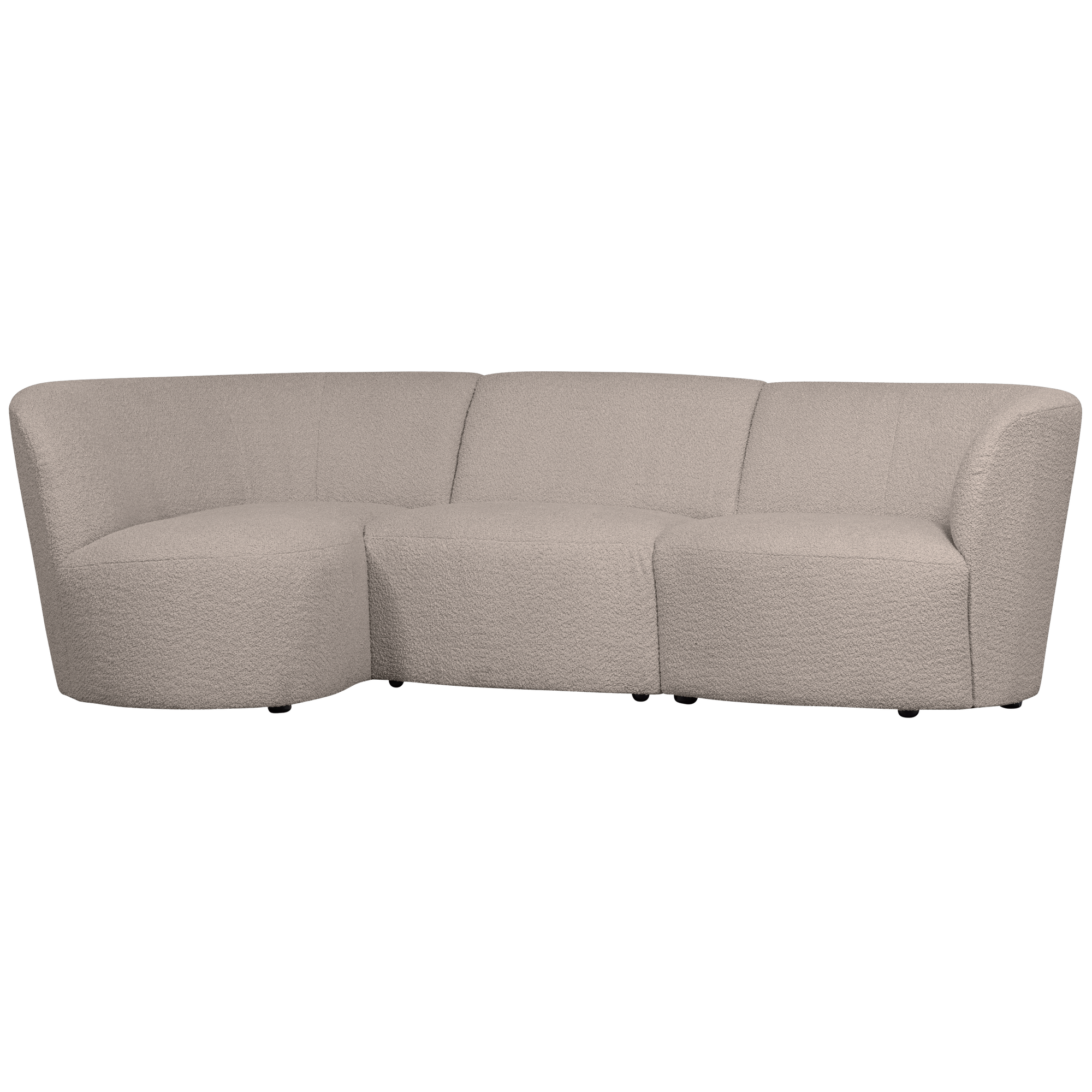 - 3-zits chaise longue bank - Speels vormgegeven design - Bekleed in een wollige boucle (100% polyester) - H 70 cm x B 230 cm x D 138 cm De Coco-serie, uit de collectie van het Nederlandse interieurmerk WOOOD, is zeer geschikt voor de grote en kleine woonruimtes. De Coco elementen zijn zeer compact van formaat, hebben een zacht afgerond design en zijn ook los in de ruimte te plaatsen vanwege de stoffering aan elke zijde. Materiaal Onze zachte Almón boucle heeft een elegante textuur die meteen warmte in huis brengt. De boucle stof heeft een Martindale van 60.000, dat betekent dat de stof geschikt is voor redelijk intensief gebruik. De dichte weeftechniek zorgt voor de sterkte van de stof, dit maakt dat de Almón boucle niet snel zal slijten of scheuren. Ook heeft elke kleur een hoge kleurvastheid, maar het is aangeraden om direct zonlicht te vermijden om kleurnuances te voorkomen. Afmetingen - Hoogte: 70 cm - Breedte: 230 cm - Diepte: 138 cm - Zithoogte: 42 cm - Zitbreedte: 190 cm - Zitdiepte: 52/118 cm - Leuninghoogte: 70/28 cm - Leuningdikte: 20 cm - Poothoogte: 2 cm - Pootdikte: ø 3 cm - Draaggewicht: 100 kg per zitplaats Onderhoud Bij eventuele vlekken direct droogdeppen met een schone doek of tissue. Beslist niet wrijven! De meeste vloeistoffen zijn te verwijderen met lauw water. Maak gebruik van een zachte, ronddraaiende beweging van buiten naar binnen. Voor jarenlange vlekbescherming kan de stof worden geïmpregneerd. Impregneer het zitmeubel zo snel mogelijk na ontvangst om direct een goede bescherming te waarborgen. Levering De Coco-elementen worden per stuk geleverd. Plaats voor het beschermen van harde vloeren viltglijders aan de onderzijde van de kunststoffen vloerbeschermers.