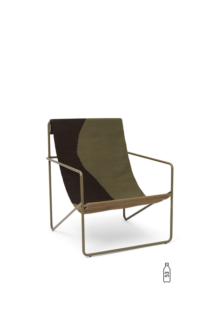 De Desert Lounge Chair, een modernistische stoel met een gracieus profiel, is gemaakt van een buisvormig gepoedercoat stalen frame met een verwisselbare, handgeweven stoffen zitting die volledig is gemaakt van gerecycled post-consumer plastic dat tot PET-garen is gesponnen.