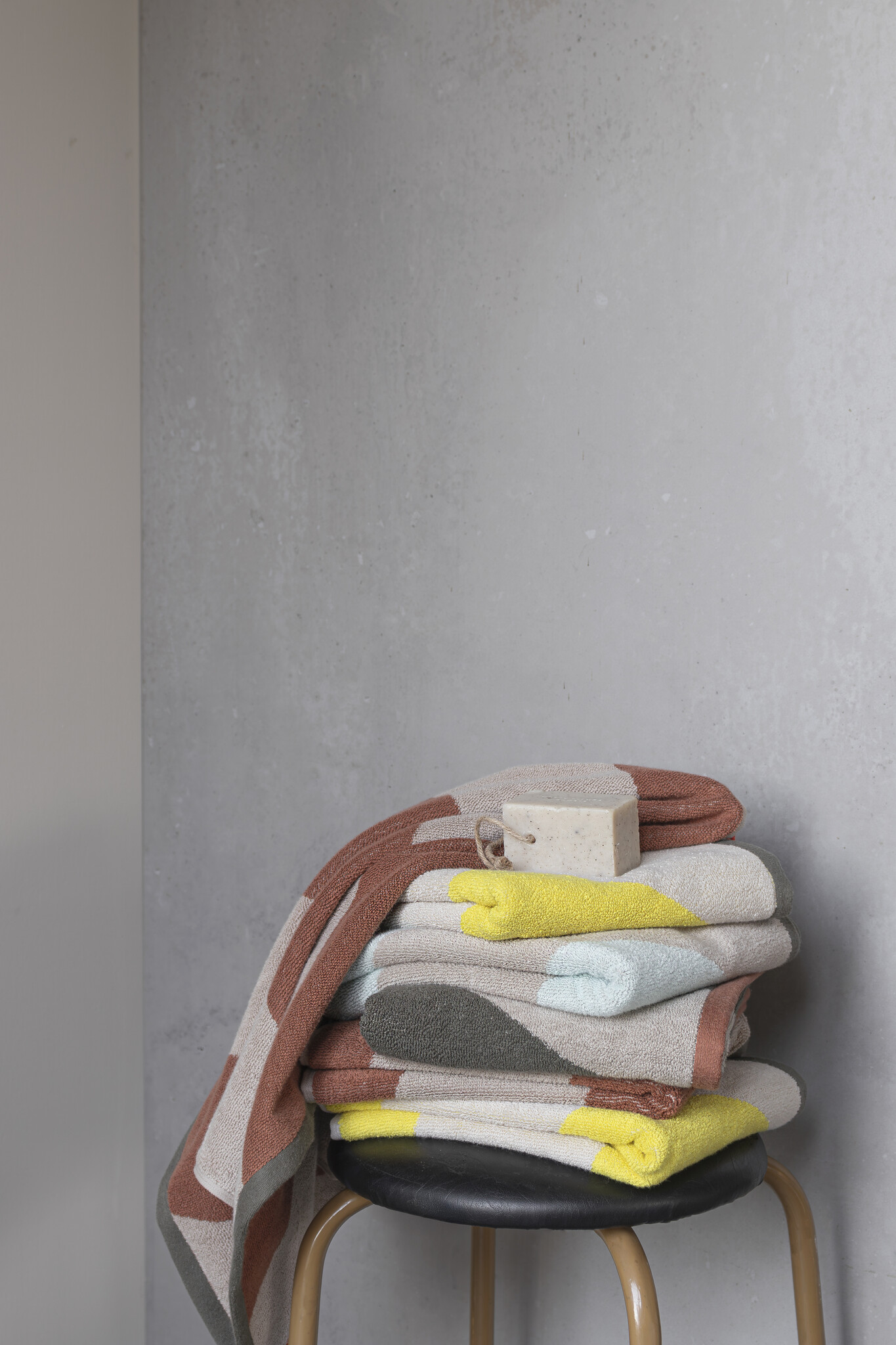 Geef je badkamer een levendige en moderne uitstraling met de DIAGONAL handdoek van Mette Ditmer. De handdoek heeft opvallende diagonale strepen in geel en beige, prachtig omlijst door een olijfgroene rand. De contrasterende oranje lus en het label combineren functionaliteit met een speels, decoratief element.