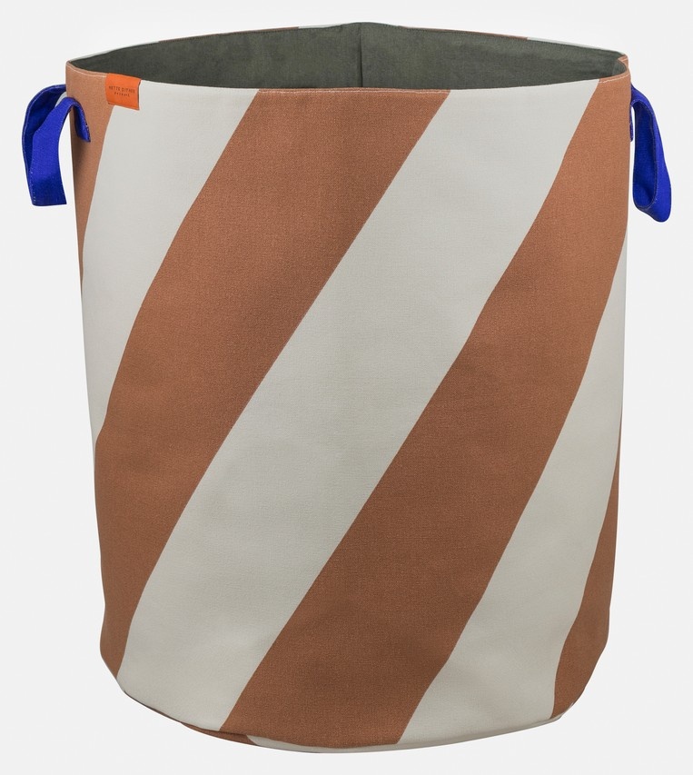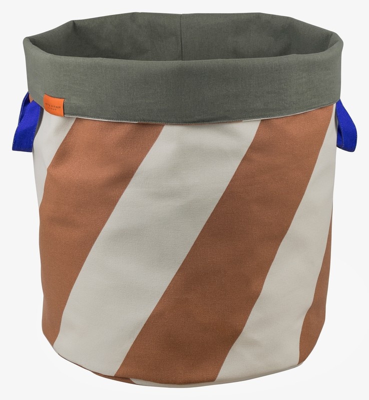 De DIAGONAL wasmand van Mette Ditmer is een stijlvolle oplossing voor je wasgoed of opbergwensen. Het opvallende patroon van diagonale strepen in warm zand en brickrood geeft deze wasmand een uitgesproken karakter, terwijl de diepe olijfgroene voering en contrasterende blauwe handvatten zorgen voor een speelse twist.