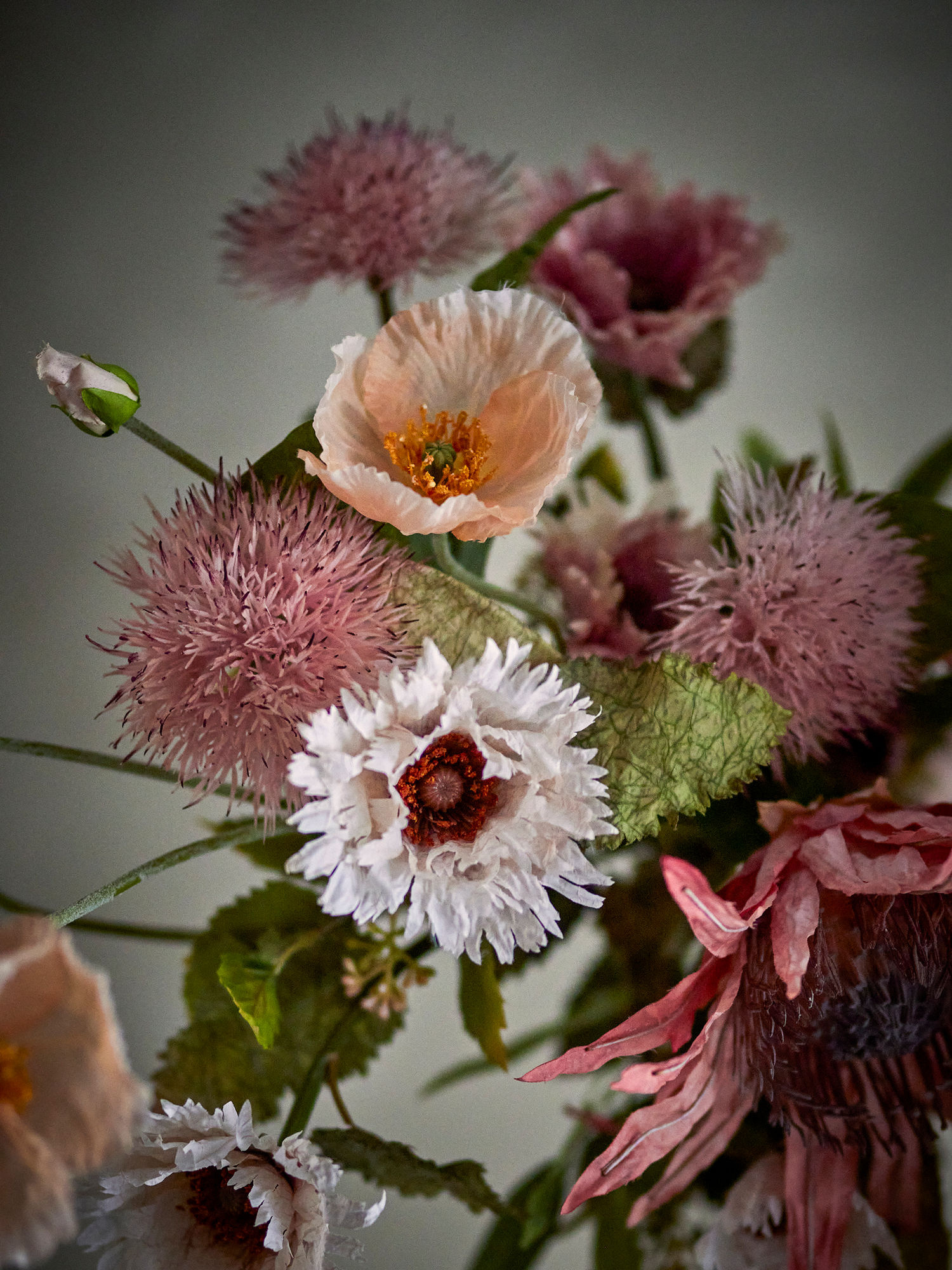 Het Dust boeket van Bloomingville is een kunstbloemstuk met volle roze bloemen en frisgroen blad. Het geheel is omwikkeld met kraftpapier en een touwtje, klaar om neer te zetten in een mooie vaas.