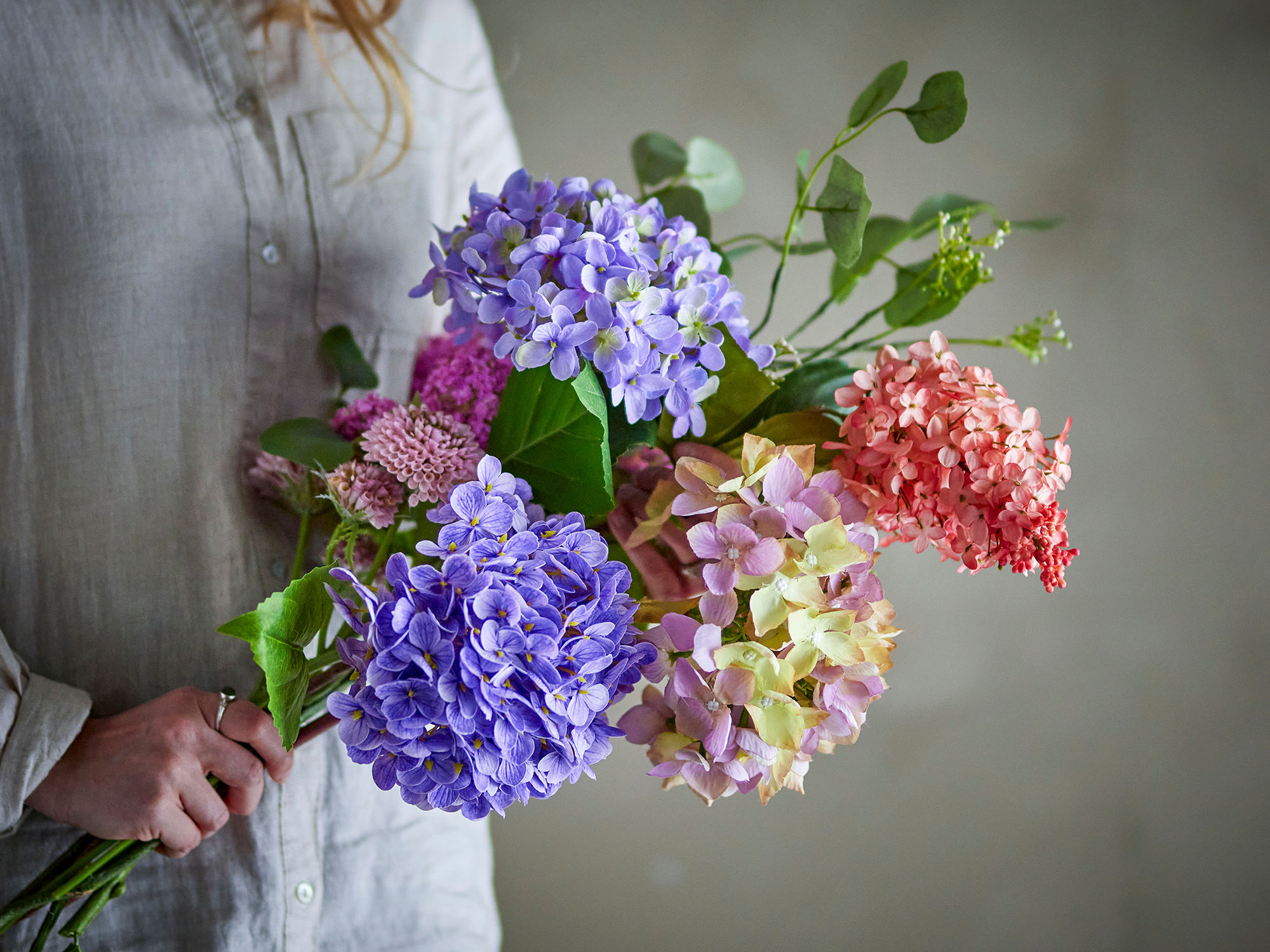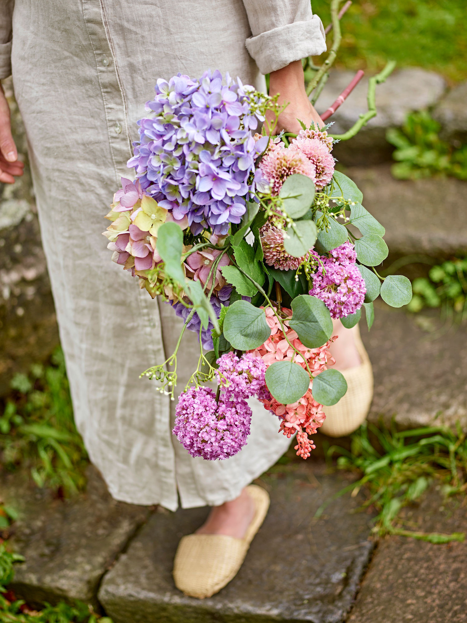 Het Edge boeket van Bloomingville is een verfijnde bos kunstbloemen in zachte paarstinten met accenten van roze, zachtgeel en diep donkergroen. Subtiele eucalyptusbladeren maken het geheel compleet. Geleverd in bruin papier – direct klaar om neer te zetten.