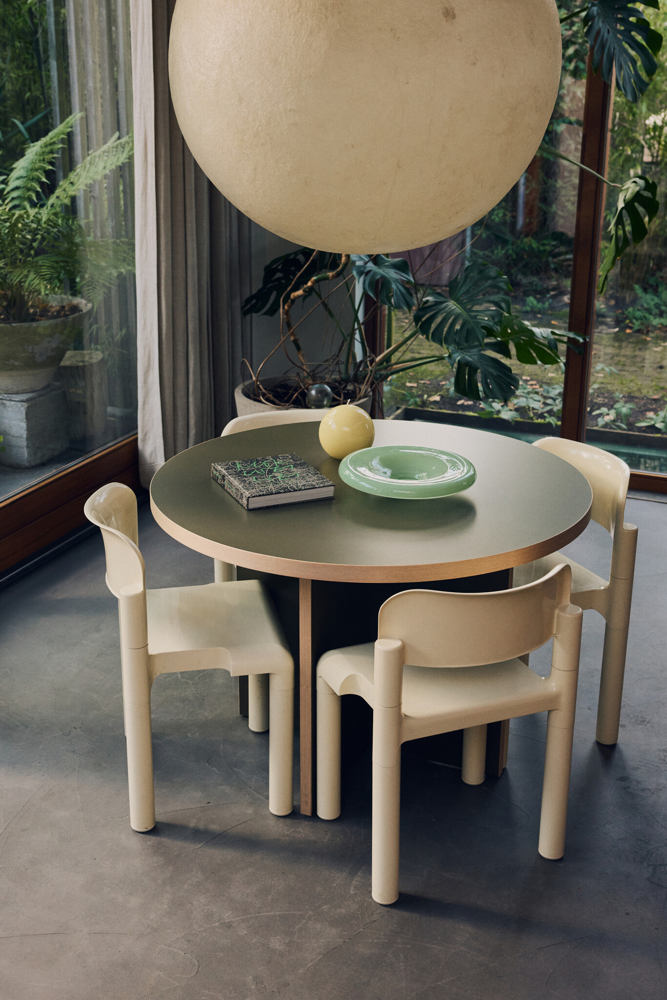 De ronde vorm zorgt voor een natuurlijke dynamiek in de ruimte en maakt elke plek aan tafel gelijkwaardig. Pale green combineert prachtig met naturel hout, linnen servetten en keramiek in aardetinten. Het resultaat is een uitnodigende setting waar comfort en design samenkomen.