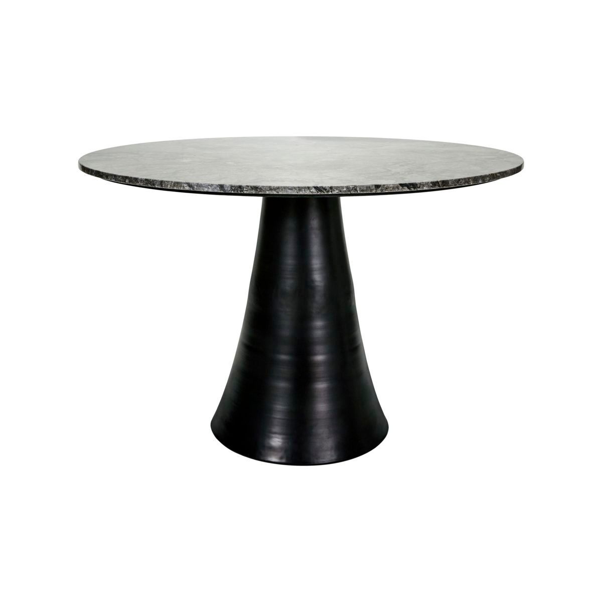 Deze handgemaakte eettafel heeft een bruin gepolijst marmeren tafelblad en een gietijzeren onderstel, wat exclusiviteit, esthetiek en tijdloosheid uitstraalt. De ronde vorm en de zuilondersteuning maken het praktisch voor het plaatsen van maximaal zes personen.