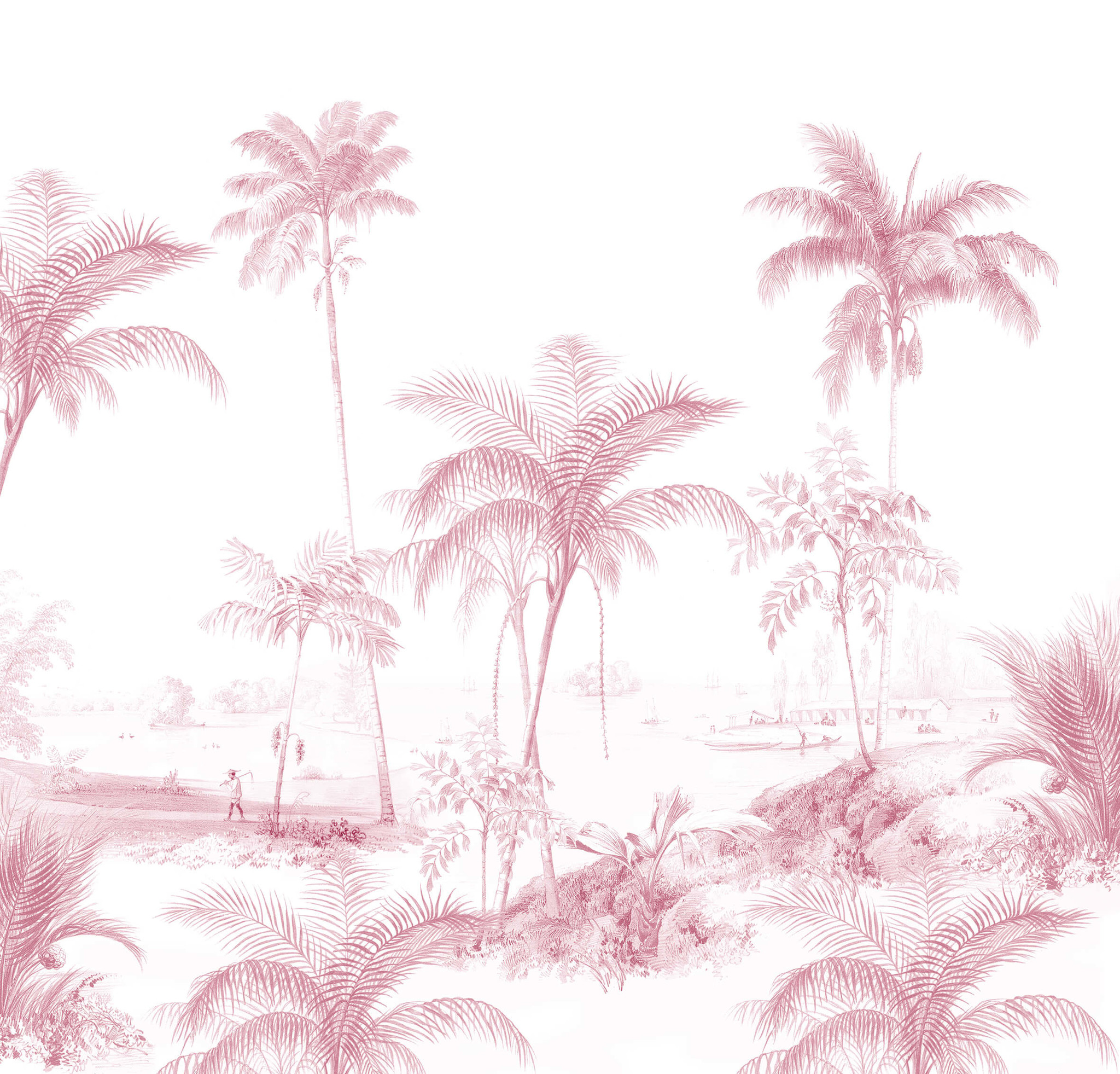 Hou jij ook van een exotische tint in de woon- of slaapkamer? Dan zit je met dit behang goed! Het behang heeft een ontwerp met een roze palmbomen setting op een witte achtergrond.