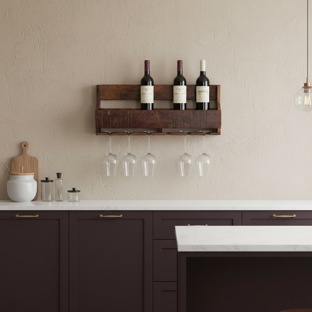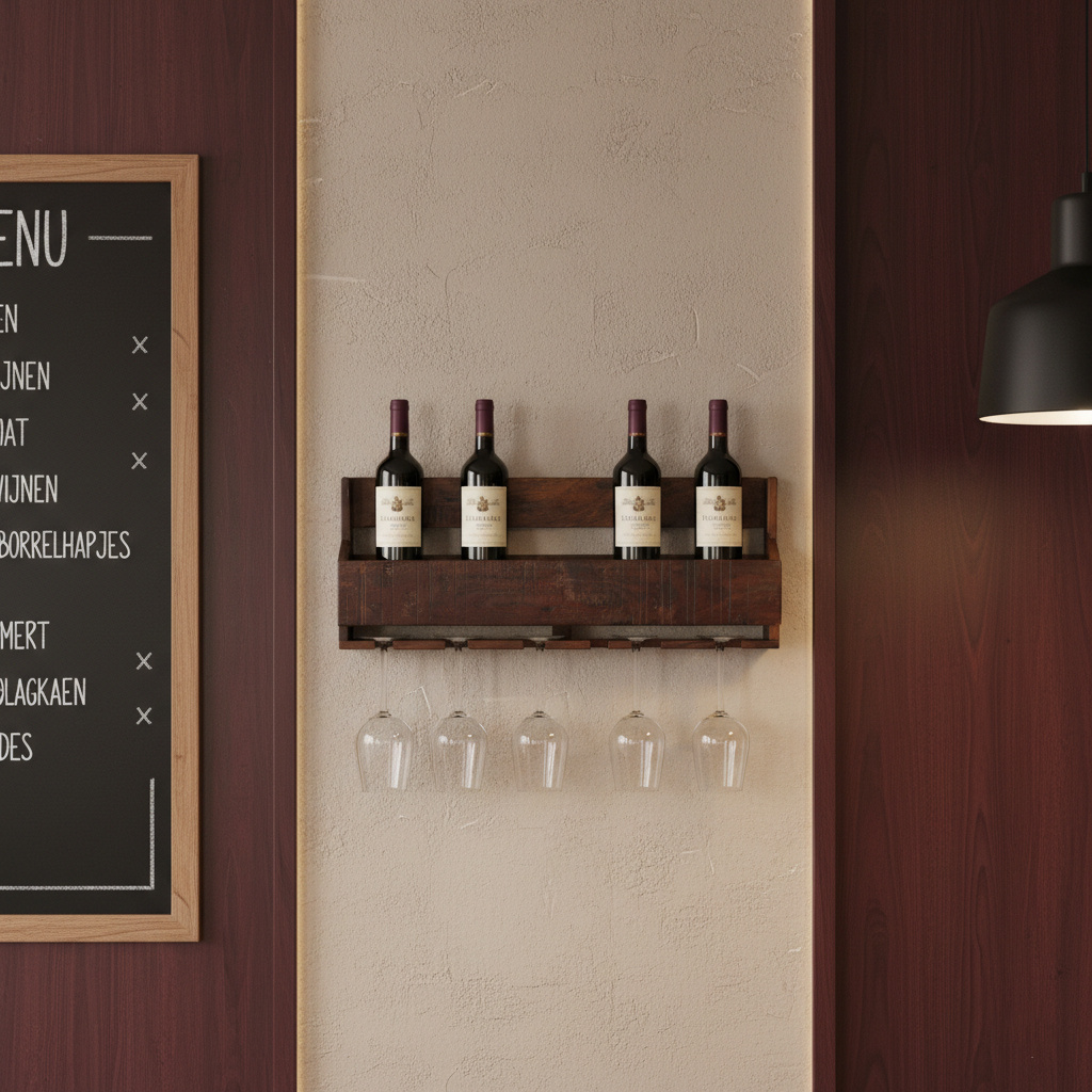 Stel je voor: het is vrijdagmiddag, de werkweek zit erop en je nodigt een paar vrienden uit voor een spontane borrel. In plaats van in de keukenkastjes te moeten duiken, loop je direct naar je Factory wijnrek aan de muur. Je kiest een mooie fles uit het bovenste gedeelte, pakt de glazen die eronder hangen in één soepele beweging mee en de avond kan beginnen. Hang het rek in de eethoek boven een dressoir of geef hem een centrale plek in de keuken. Combineer het wijnrek met een stoere kurkentrekker en een groene hangplant die over de zijkant naar beneden valt voor een levendig effect. Het warme, donkere hout steekt prachtig af tegen een lichte muur, maar komt ook volledig tot zijn recht op een donkere of bakstenen achtergrond voor die ultieme 'urban jungle' of loft-vibe.