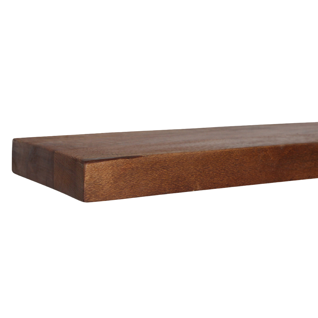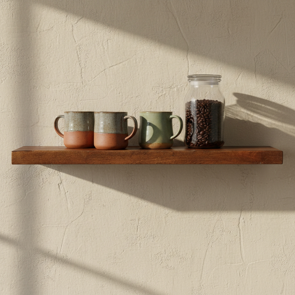 Stel je voor: je hebt net die ene saaie wand in de woonkamer onder handen genomen. Je hangt twee van deze 80 cm planken boven elkaar, precies versprongen voor een speels effect. Op de bovenste plank zet je een paar van je favoriete reisboeken, gesteund door een zware, vintage boekensteun. Op de onderste plank komt een kleine hangplant die langzaam over de rand naar beneden groeit, gecombineerd met een sfeervolle geurkaars en een ingelijste zwart-wit foto. Doordat de plank zweeft, lijkt je muur optisch groter en rustiger, terwijl het warme hout direct voor die gezellige 'thuis-vibe' zorgt. Of je hem nu in de keuken gebruikt voor je mooiste servies of in de hal voor je sleutels en een spiegel: het karakter spat er vanaf.