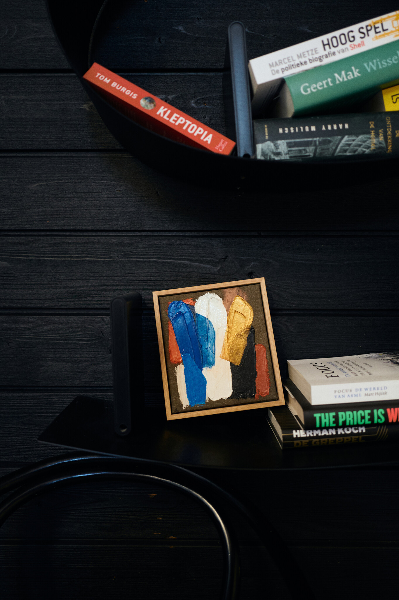Moonlight Strokes is klein, maar heeft een bijzondere gloed. Heldere blauwtinten en zacht goud liggen in laagjes over elkaar, waardoor het werk diepte krijgt en bijna licht lijkt te geven. Perfect als subtiel accent op een smalle muur, in een nis of als onderdeel van een speelse compositie met meerdere kleine werken. Het is zo’n detail dat je interieur net wat verfijnder laat voelen, zonder de aandacht op te eisen.