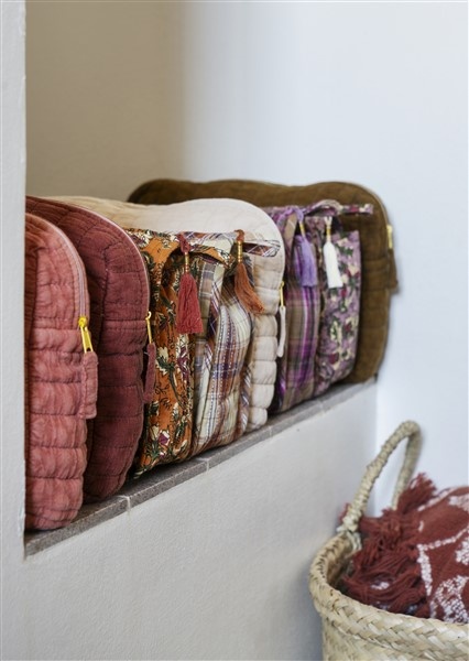 Toilettas in diepe aardetinten met handgemaakte details
