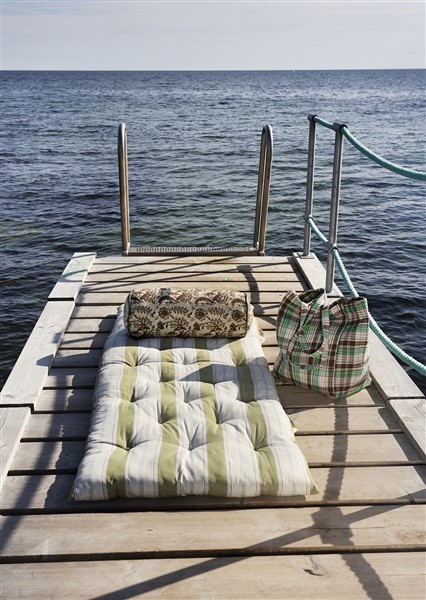 Geïnspireerd op traditionele Deense folk‑strepen, combineert dit gestreepte matras zachte tinten van groen, wit, lichtblauw en grijs. Gemaakt van stevig katoen en gevuld met katoenresten, biedt het veelzijdige inzetbaarheid voor daybeds, sofa’s, terrace lounges of vloeren.