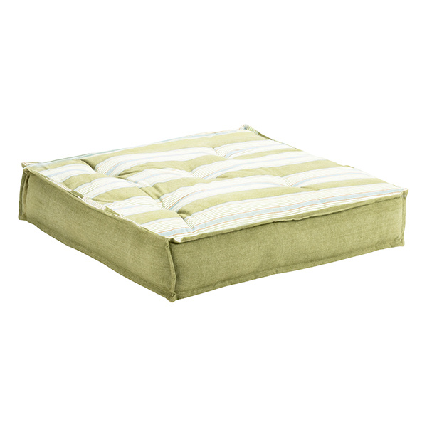 Dit royale matraskussen is niet alleen comfortabel, maar ook bewust gemaakt. De vulling bestaat uit versnipperde reststoffen van katoen, wat het een circulair karakter geeft. De stevige katoenen hoes voelt zacht aan en is afgewerkt met subtiele stiknaden die de vorm behouden. De kleurencombinatie van groen, wit, lichtblauw en grijs past moeiteloos in zowel minimalistische als meer eclectische interieurs.