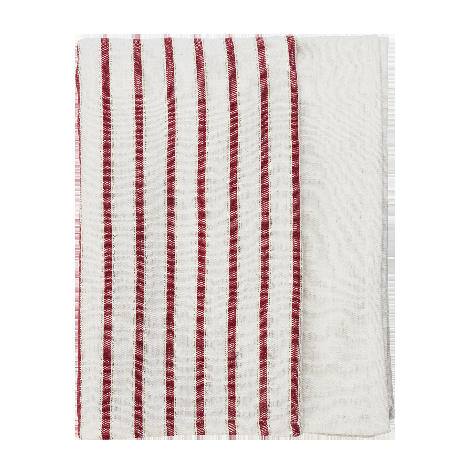 Dit tafelkleed van Madam Stoltz brengt een warme en uitnodigende sfeer aan tafel. Het is vervaardigd in India van 95% katoen en 5% lurex, waardoor het een stevige kwaliteit heeft met een subtiele glinstering. De combinatie van off white, rood en goud is stijlvol en tijdloos, perfect voor een gezellige brunch of een feestelijk diner.