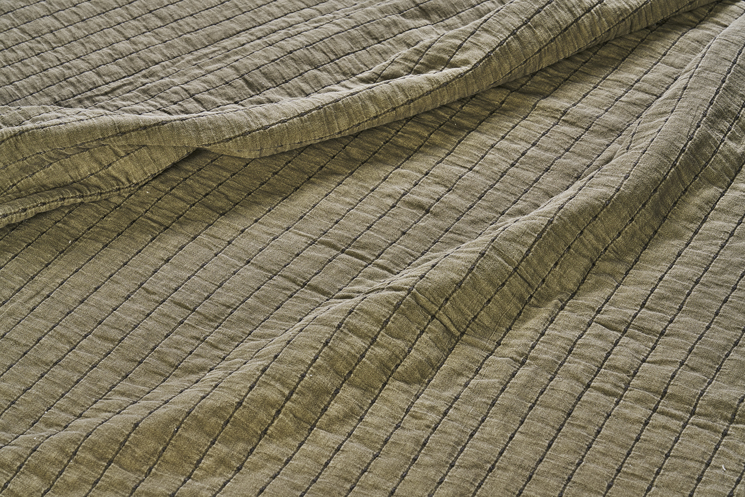 Deze royaal gewatteerde plaid in khaki en donkergroen is een stijlvolle toevoeging aan elke slaapkamer of zithoek. Gemaakt van zacht katoen met een vulling van polyester en voorzien van een stonewashed finish voor die subtiel verweerde look.