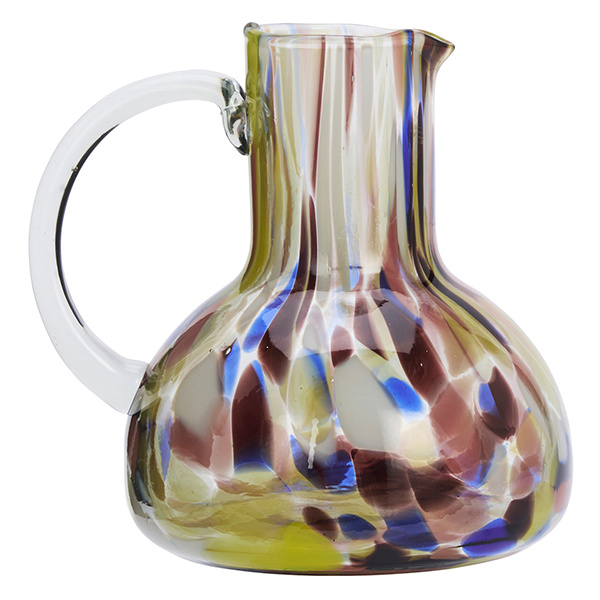 Deze glazen kan in multicolor is een feest voor het oog. Geel, bruin, blauw, wit, oranje en helder glas vloeien samen tot een speels geheel. Gemaakt van deels gerecycled glas in India, met unieke spikkels per stuk.