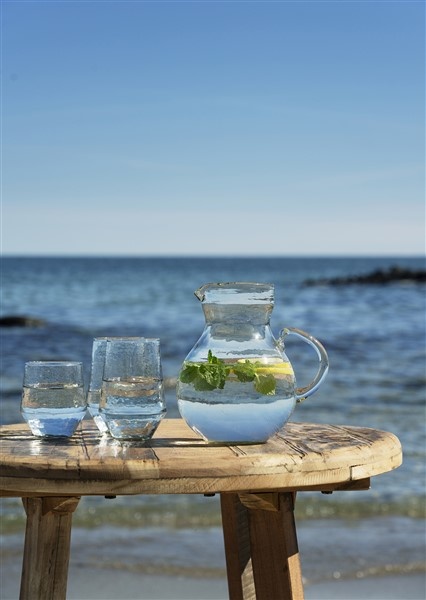 De kan is gemaakt van deels gerecycled glas, wat ieder exemplaar een subtiel eigen karakter geeft. Een sfeervolle en veelzijdige keuze voor wie houdt van rustig servies met een lichte, natuurlijke uitstraling.