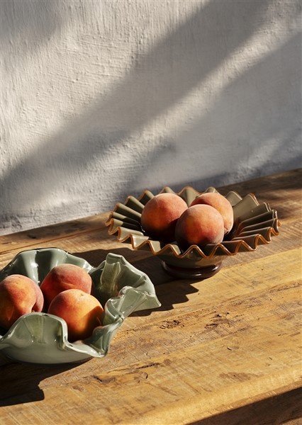 Deze glazen schaal van Madam Stoltz combineert diepe groentinten met een warme bruine ondertoon en subtiele art deco-invloeden. Het resultaat is een elegant vormgegeven stuk dat zowel functioneel is als sculpturaal oogt. De zachte lijnen en het kleurverloop geven deze schaal een serene uitstraling, perfect voor stijlvolle interieurs.