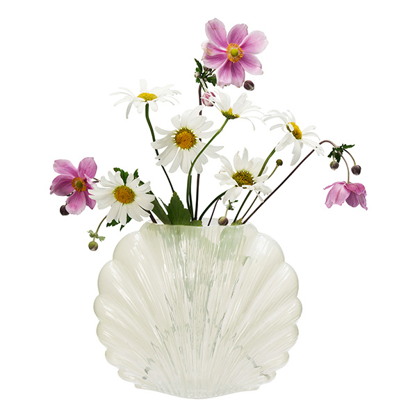 Deze elegante vaas in een zachte crèmekleur heeft een licht parelmoerachtige glans en een organische vorm die doet denken aan schelpen. Perfect als decoratief accent, met of zonder bloemen.