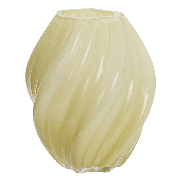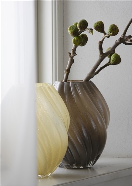 Deze elegante vaas van Madam Stoltz is een blikvanger op zich. De warme honingkleur brengt gezelligheid in huis, terwijl de gedraaide vorm in het glas een subtiele speelsheid toevoegt. Ideaal voor een royaal boeket, een tak met bloesem of als sculpturaal object in z'n eentje.