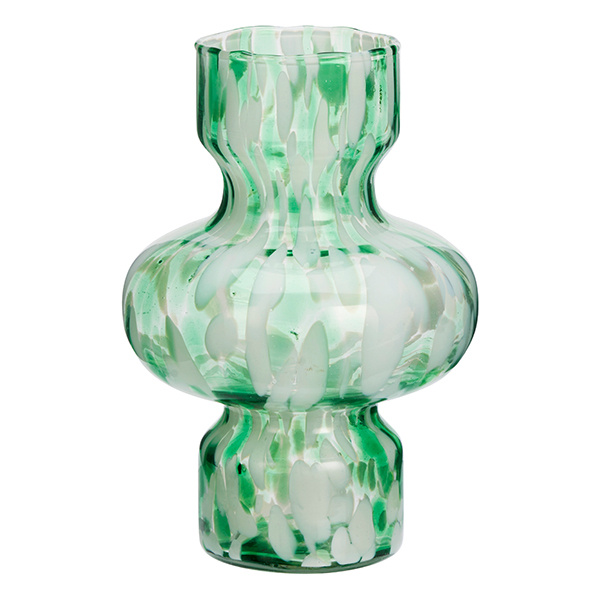 De groene en witte stippen zorgen voor een rustige maar levendige uitstraling. Combineer met andere vazen in natuurlijke kleuren of laat hem solo stralen in het licht. Door het ambachtelijke proces bevat het glas subtiele luchtbelletjes en variaties die het stuk karakter geven.