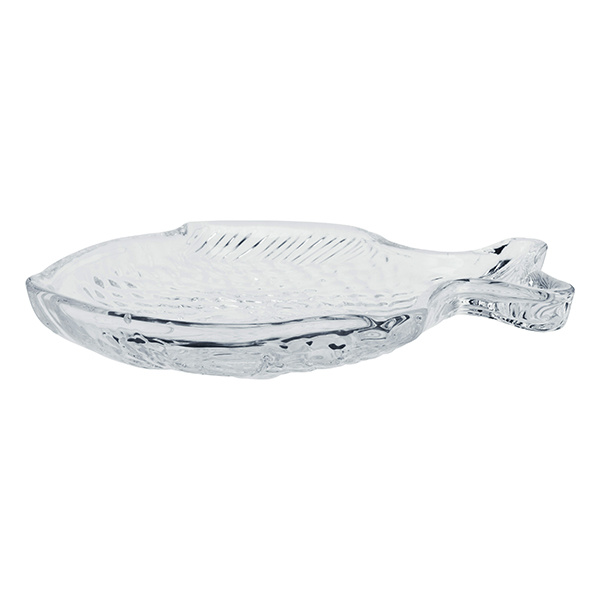 Deze glazen visschaal van Madam Stoltz in transparant glas combineert eenvoud met elegantie. Het subtiele visvormige reliëf en de heldere kleur maken dit een veelzijdige schaal voor in huis – van sieradenschaaltje tot serveertray.