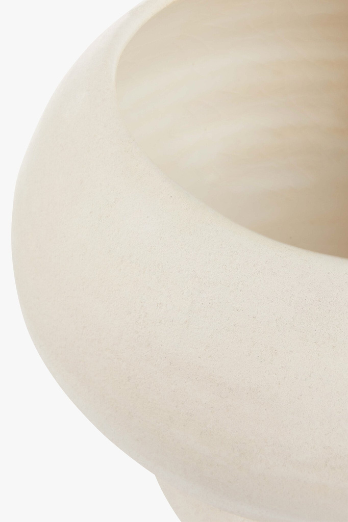 De buitenkant van de ecru kleurige vaas heeft een matte structuur die de natuurlijke schoonheid van het aardewerk accentueert. De binnenkant is geglazuurd, wat zorgt voor een subtiele glans en hierdoor is zij tevens waterdicht. Het contrast tussen de wat ruwere buitenkant en de gladde binnenkant is een fijn detail.