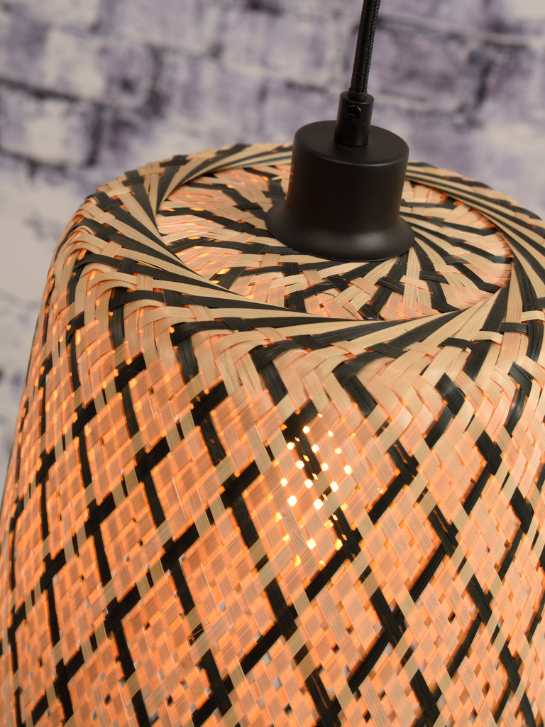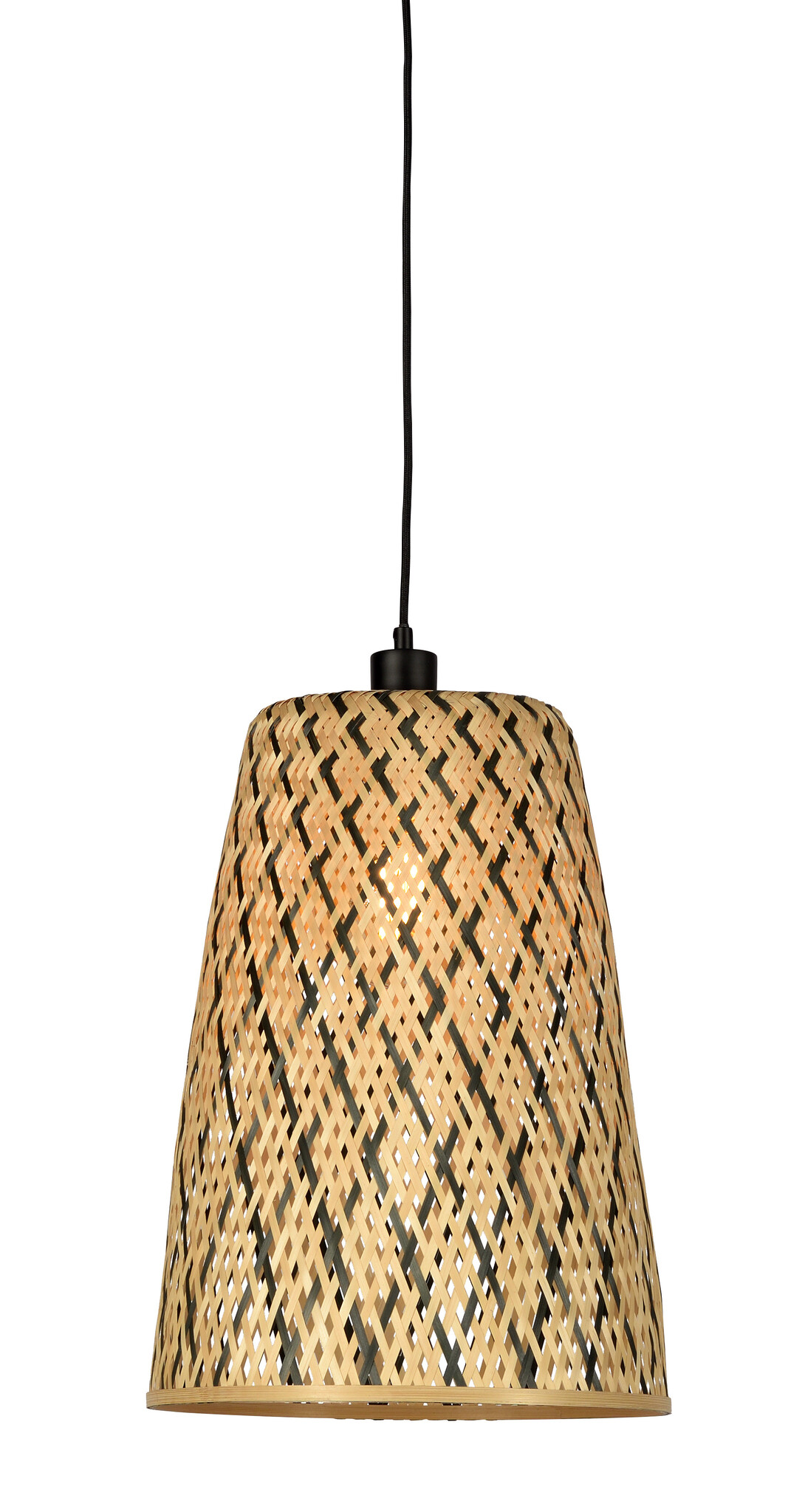 Vernoemd naar de Indonesische streek met zijn afgelegen tropisch regenwoud, kronkelende rivieren en schilderachtige bergen in het binnenland, zal de Kalimantan bamboe hanglamp met zijn knappe toelopende lampenkap een warme en uitnodigende aanwinst zijn voor het interieur van je huis of kantoor. De kap is zorgvuldig en fijntjes met de hand gevlochten van duurzaam bamboe met spleten die het licht filteren om een zachte ontspannen sfeer te scheppen. De lamp straalt ook direct licht naar beneden, zodat je je kunt concentreren op avondlijke bezigheden. Met kap afmetingen 34 cm diameter en 48 cm hoogte is Kalimantan zeer veelzijdig en staat hij ideaal, alleen of in combinatie met andere lampen uit de Kalimantan serie tegen elk decor. Ze is geschikt voor lichtbronnen tot 40W.