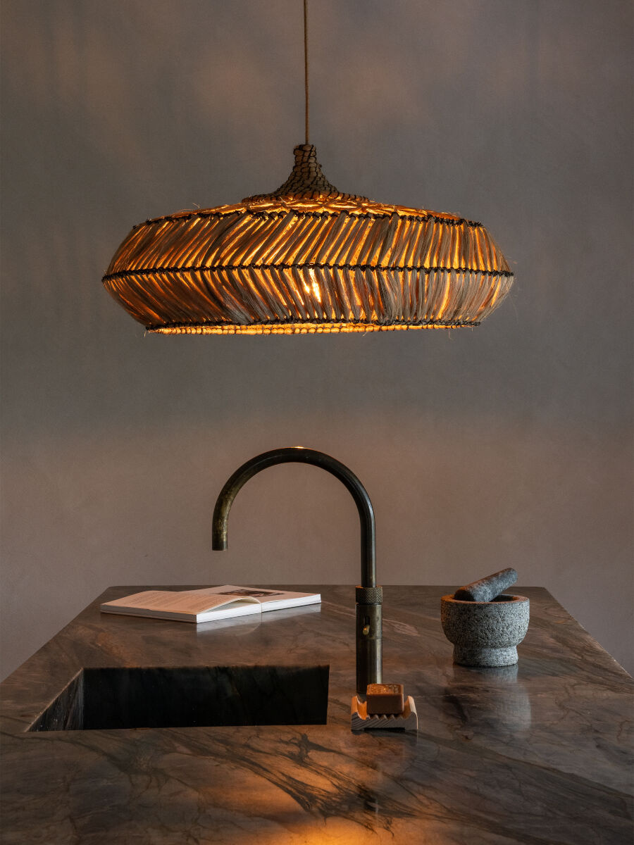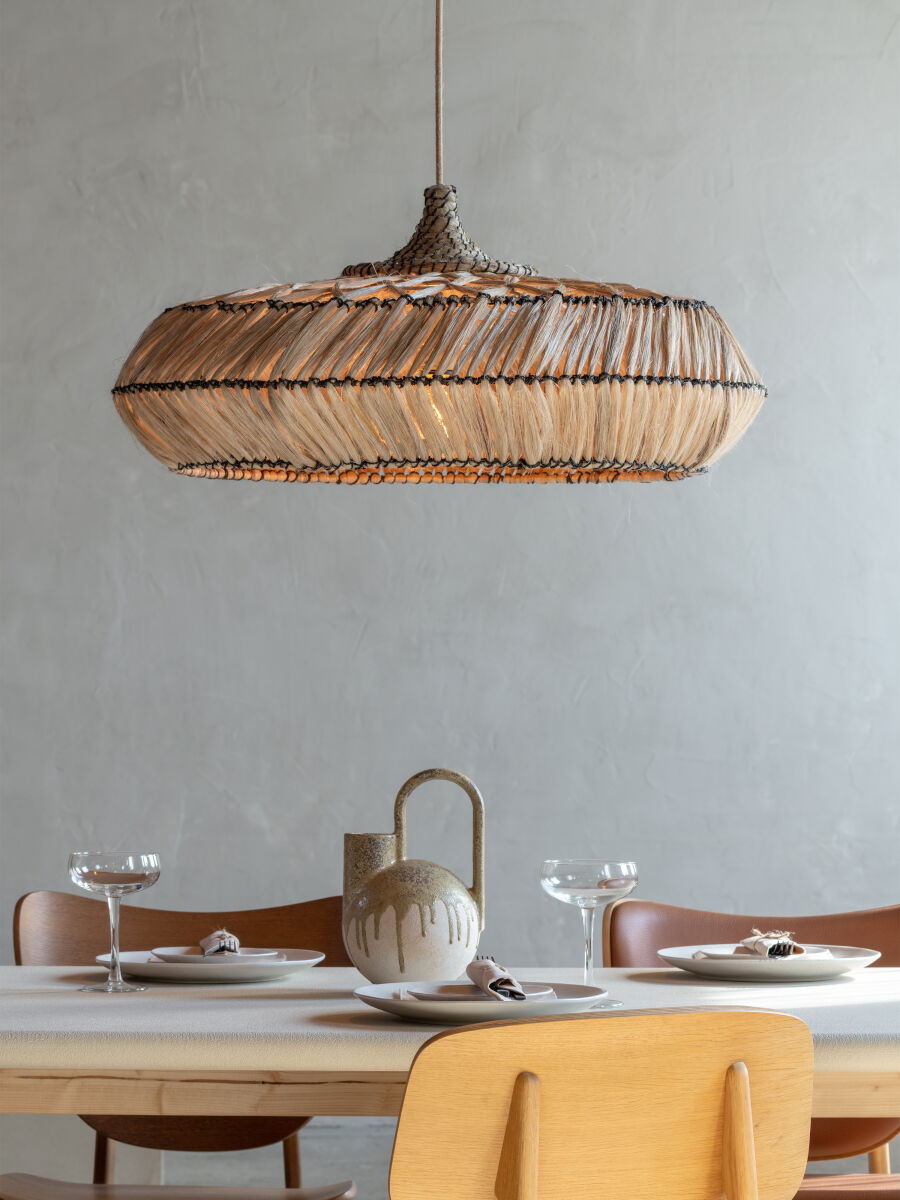 De grote Rinjani hanglamp valt op door haar indrukwekkende formaat en ambachtelijke afwerking. De lage, brede vorm zorgt voor een warme en gelijkmatige lichtverdeling in ruime interieurs.