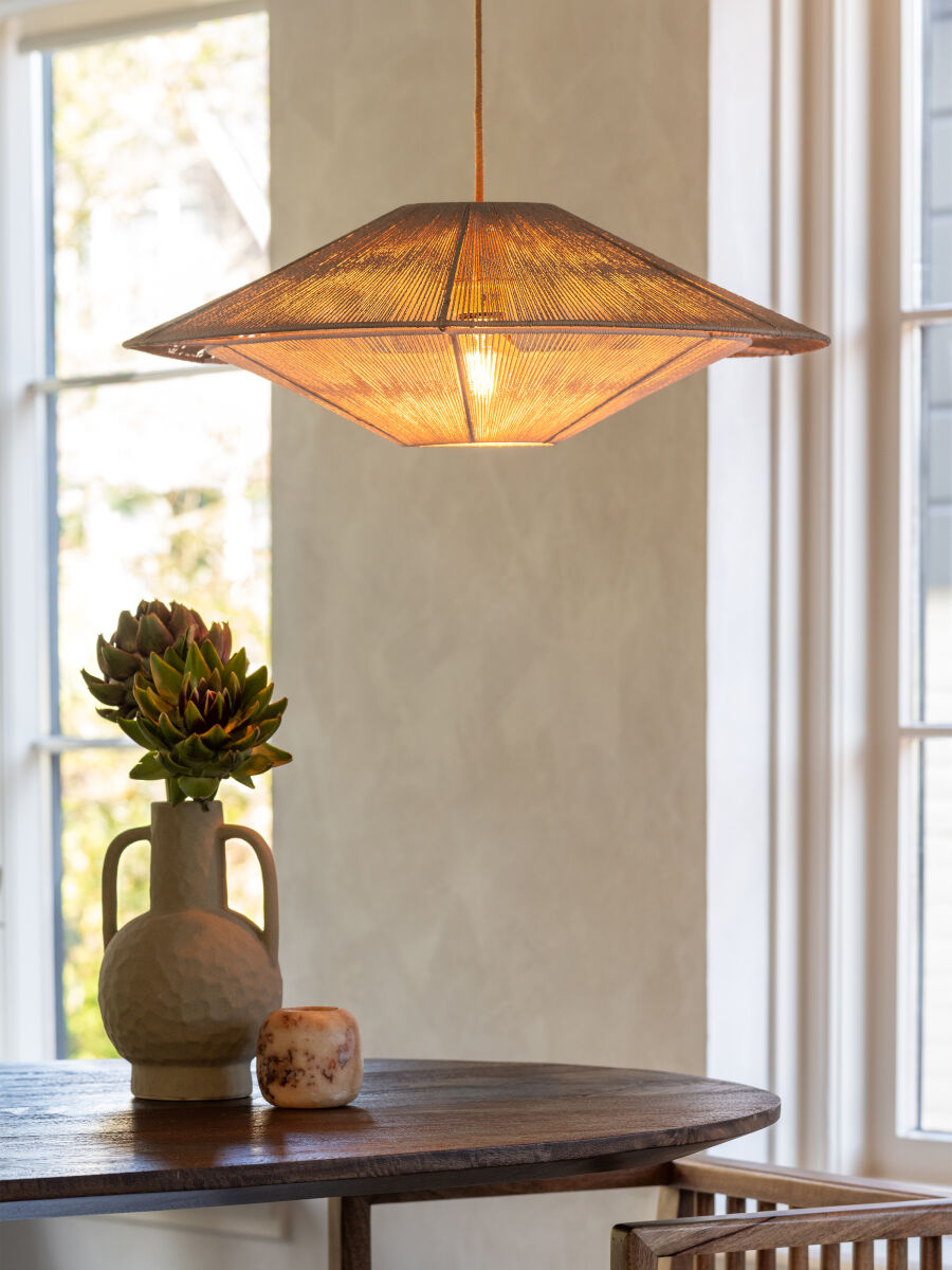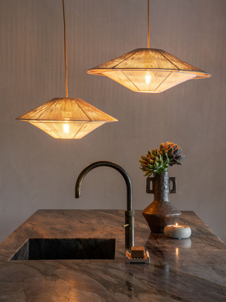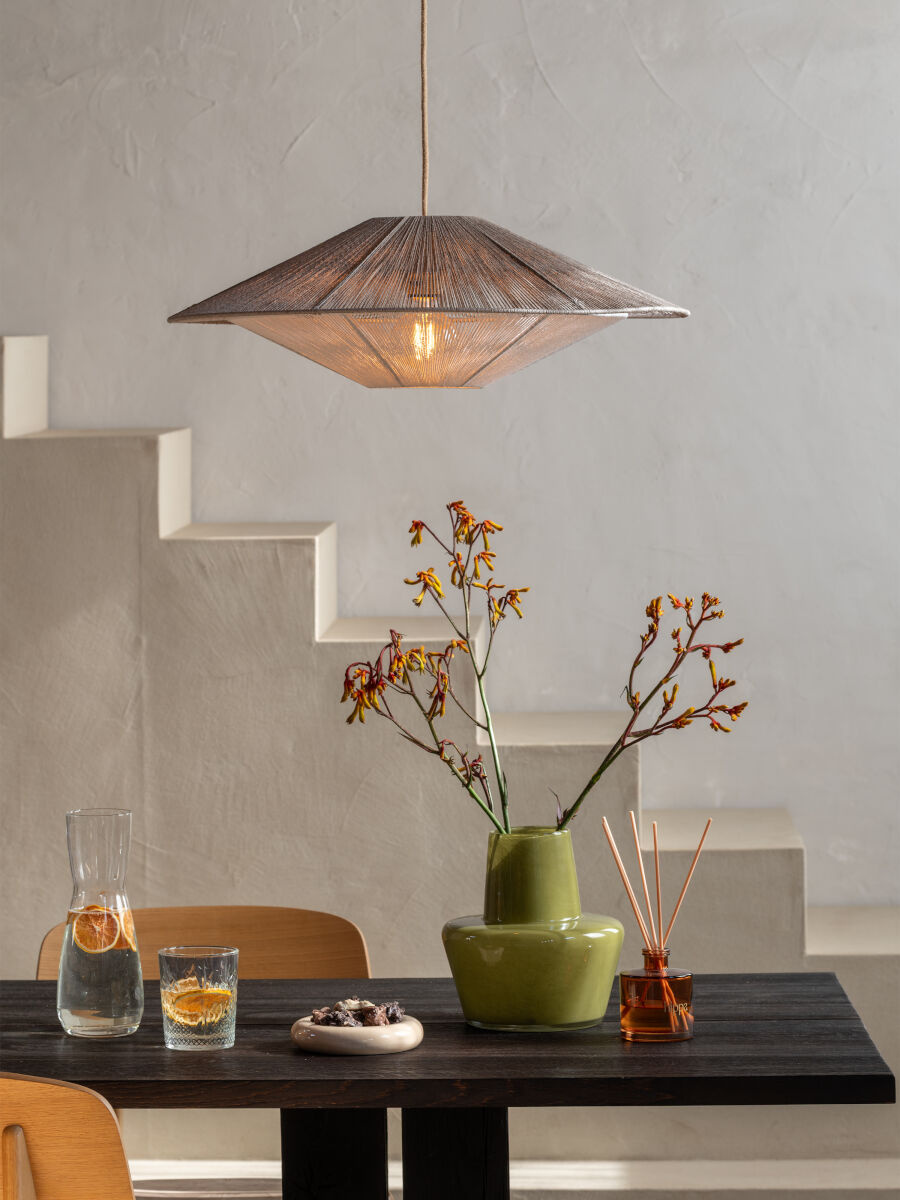 De grote Lumbini hanglamp heeft een brede, zwevende vorm die direct rust brengt in de ruimte. Het open geweven papiertouw laat het licht zacht in alle richtingen verspreiden, waardoor een evenwichtige en ontspannen sfeer ontstaat.