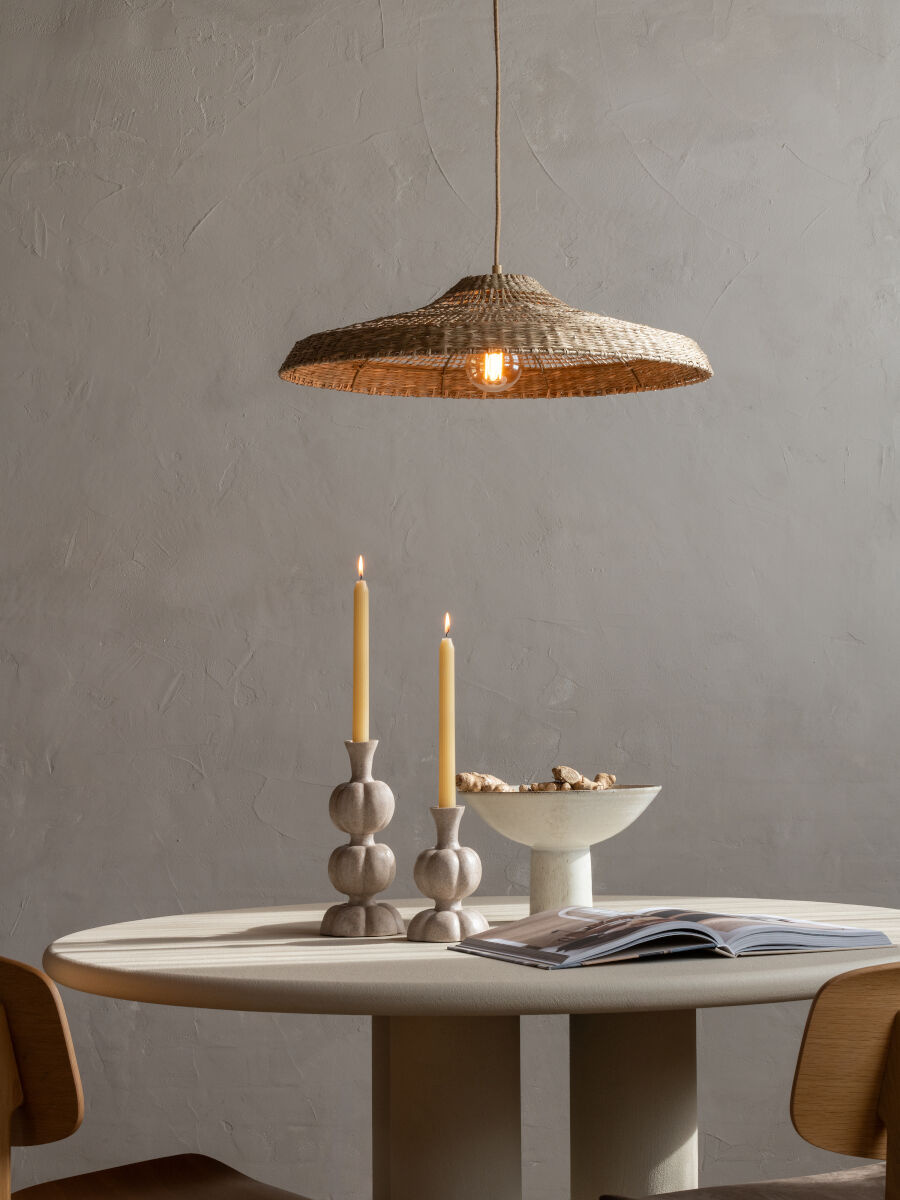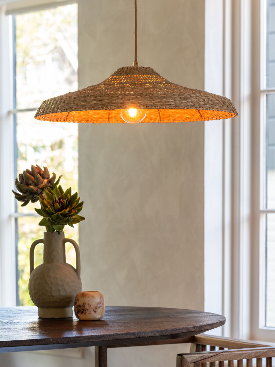 De Santorini hanglamp brengt een subtiele, mediterrane sfeer in huis. De geweven kap van zeegras heeft een brede, ondiepe vorm die het licht zacht en open verspreidt.