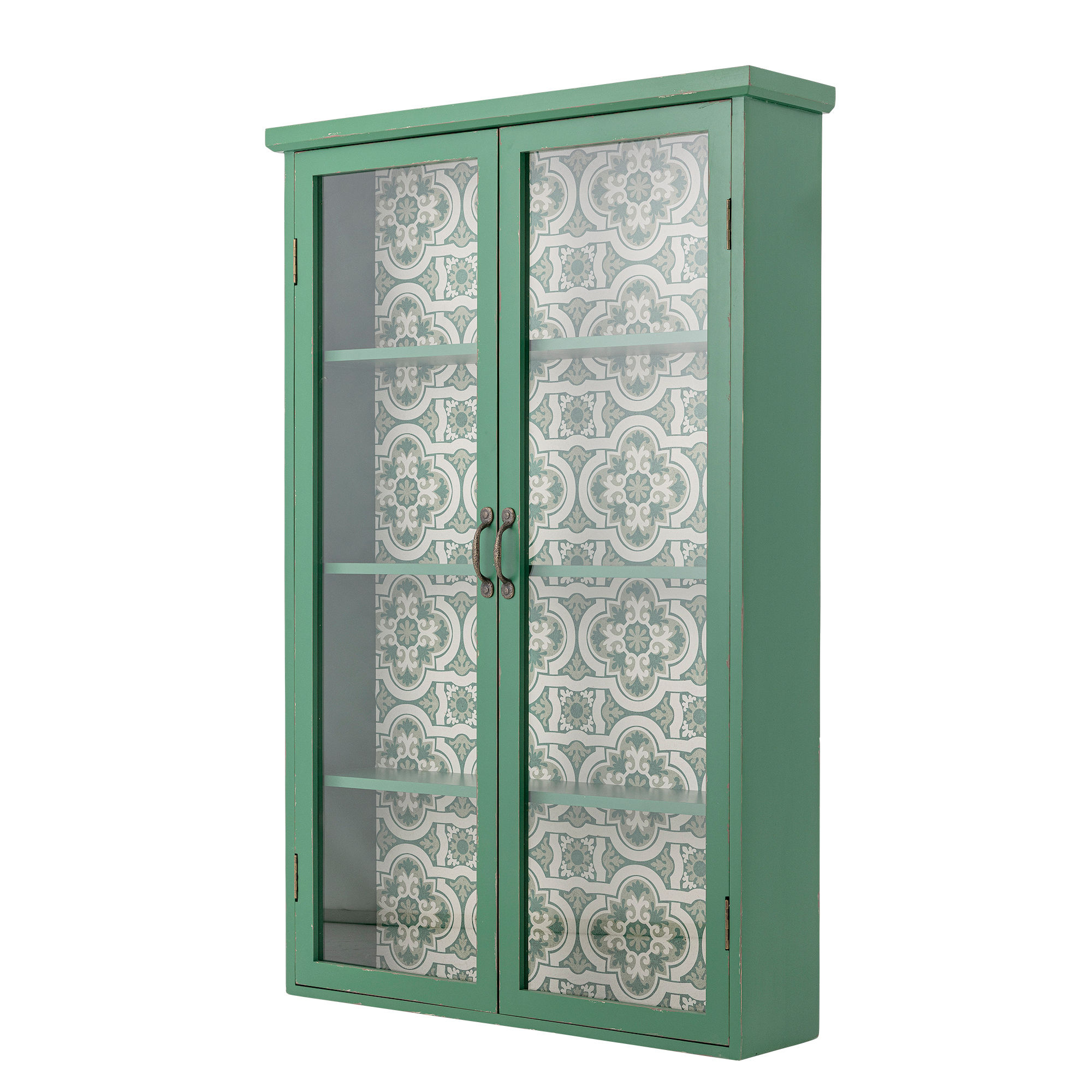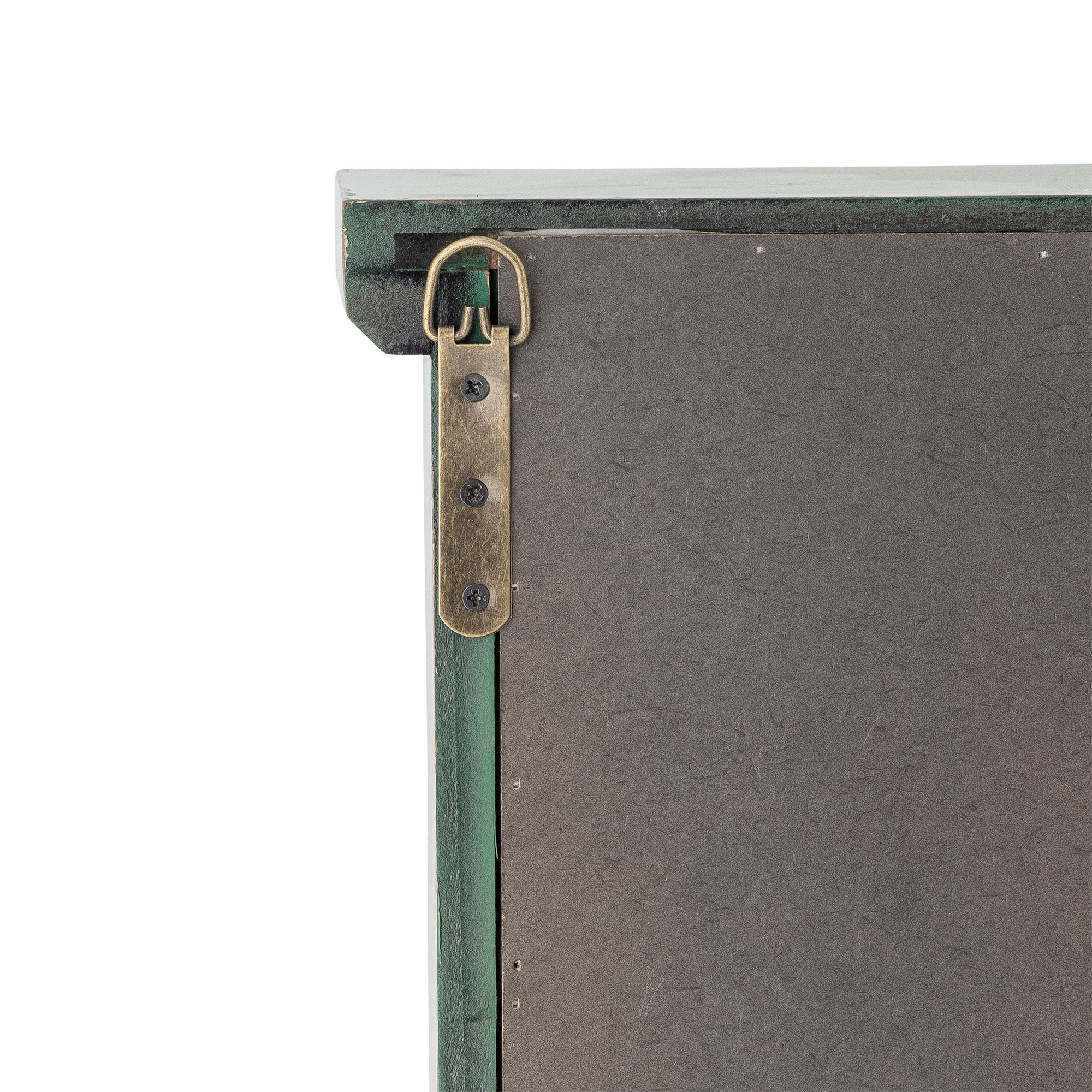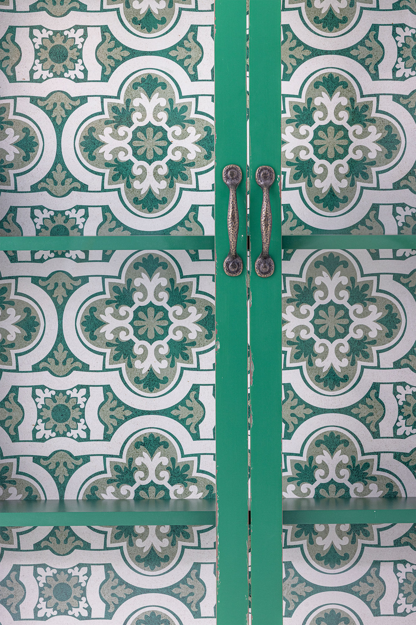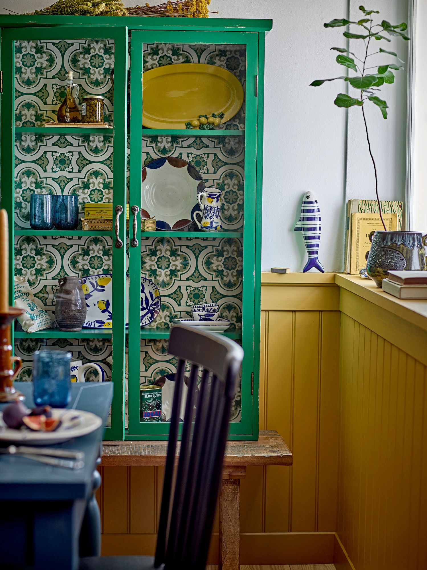 De Hazem kast van Creative Collection is een echte blikvanger. Gemaakt van vurenhout en MDF, met een verweerde groene lak en glazen deuren. De binnenkant verrast met een betegelde print in diepe groentinten en crème, wat een speels contrast vormt met het rustieke uiterlijk van de kast.