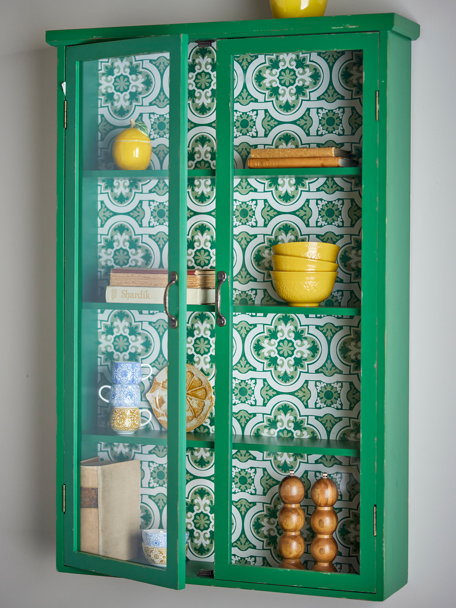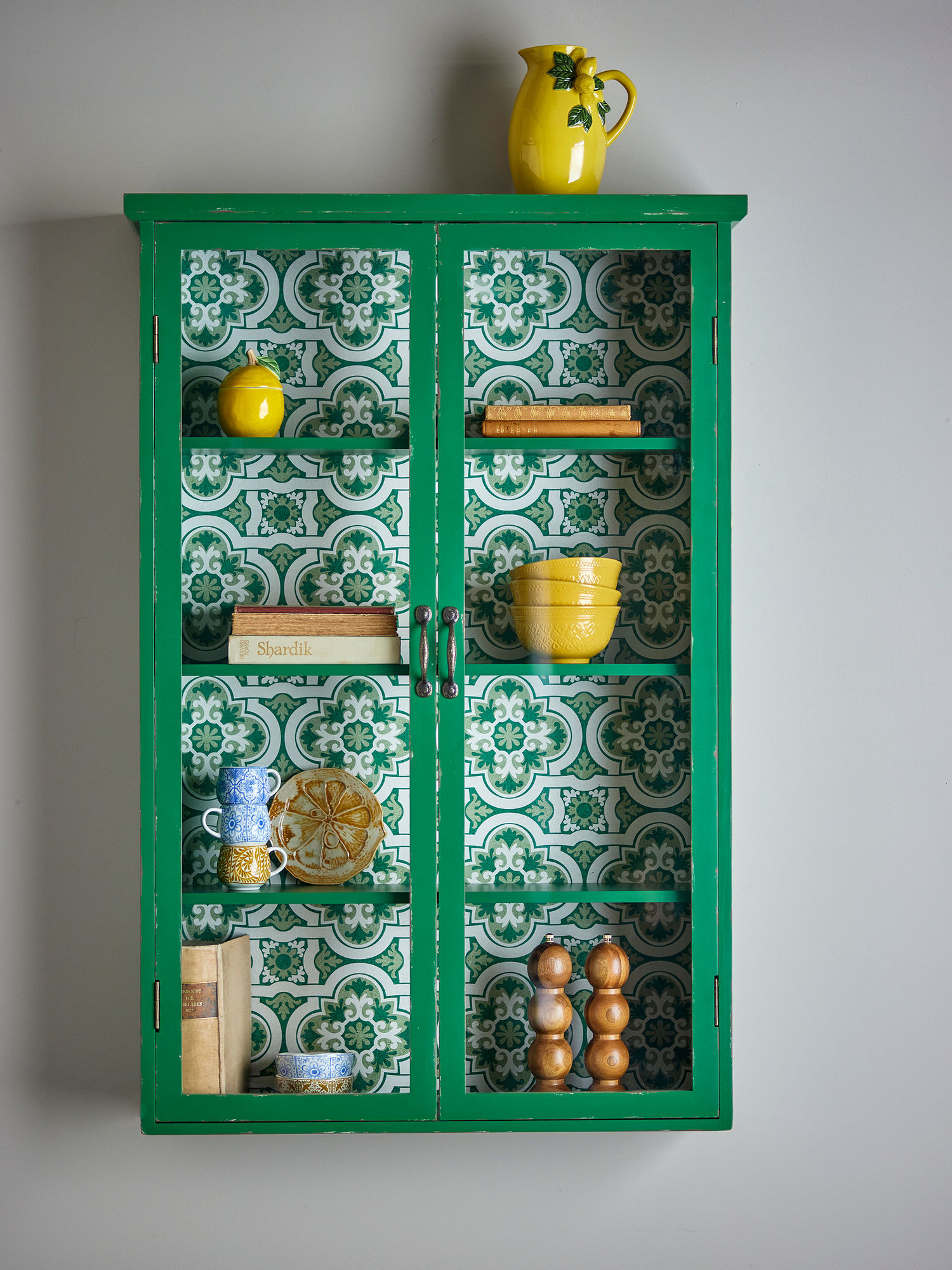 Opbergen met karakter: groene vitrinekast met printinterieur